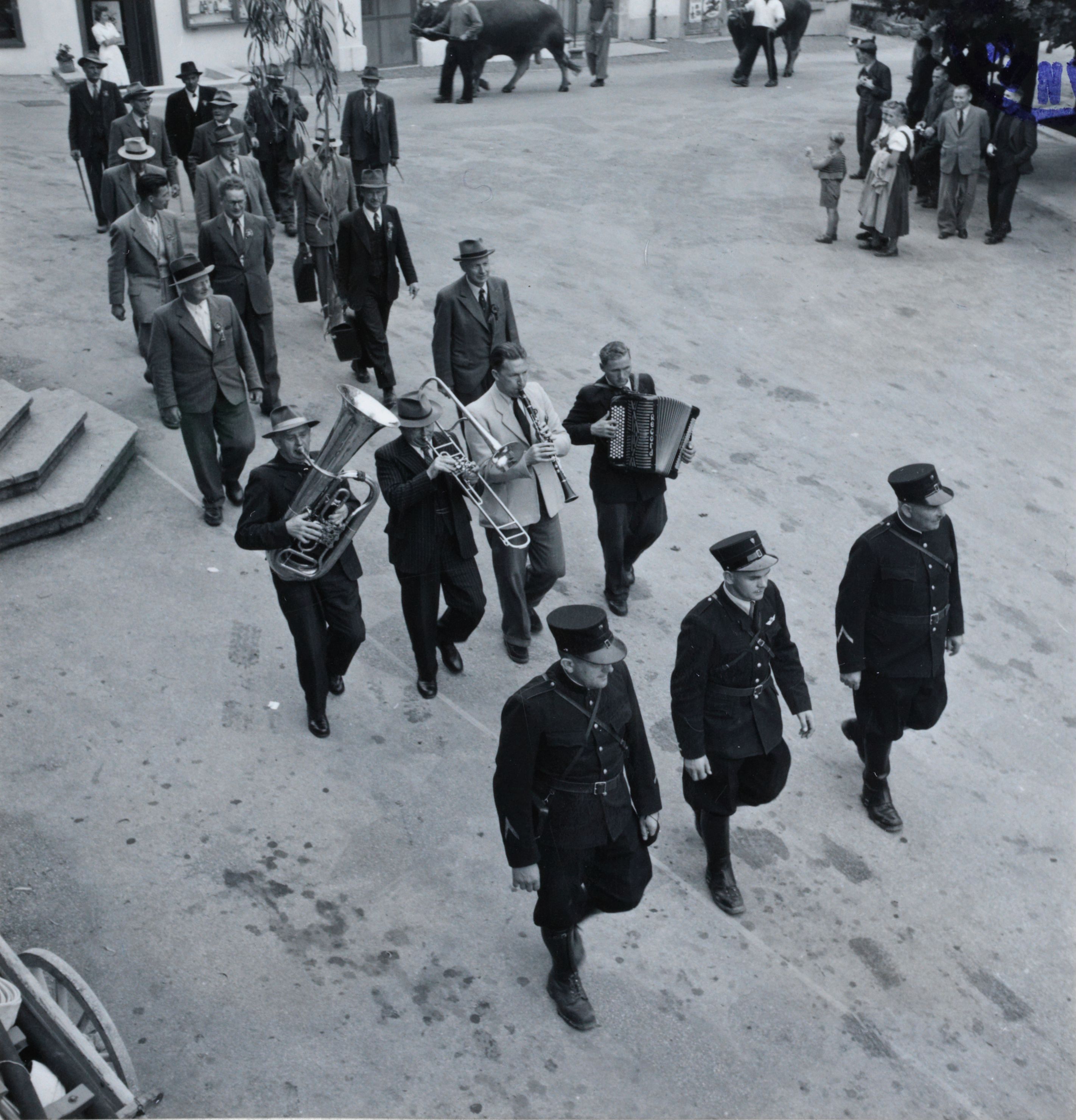 Auf der Karteikarte steht mit Schreibmaschine geschrieben: Viehausstellung in Wollerau, 27./28. September 1951. Der Festzug. I. Polizei, Musik, Komitee.