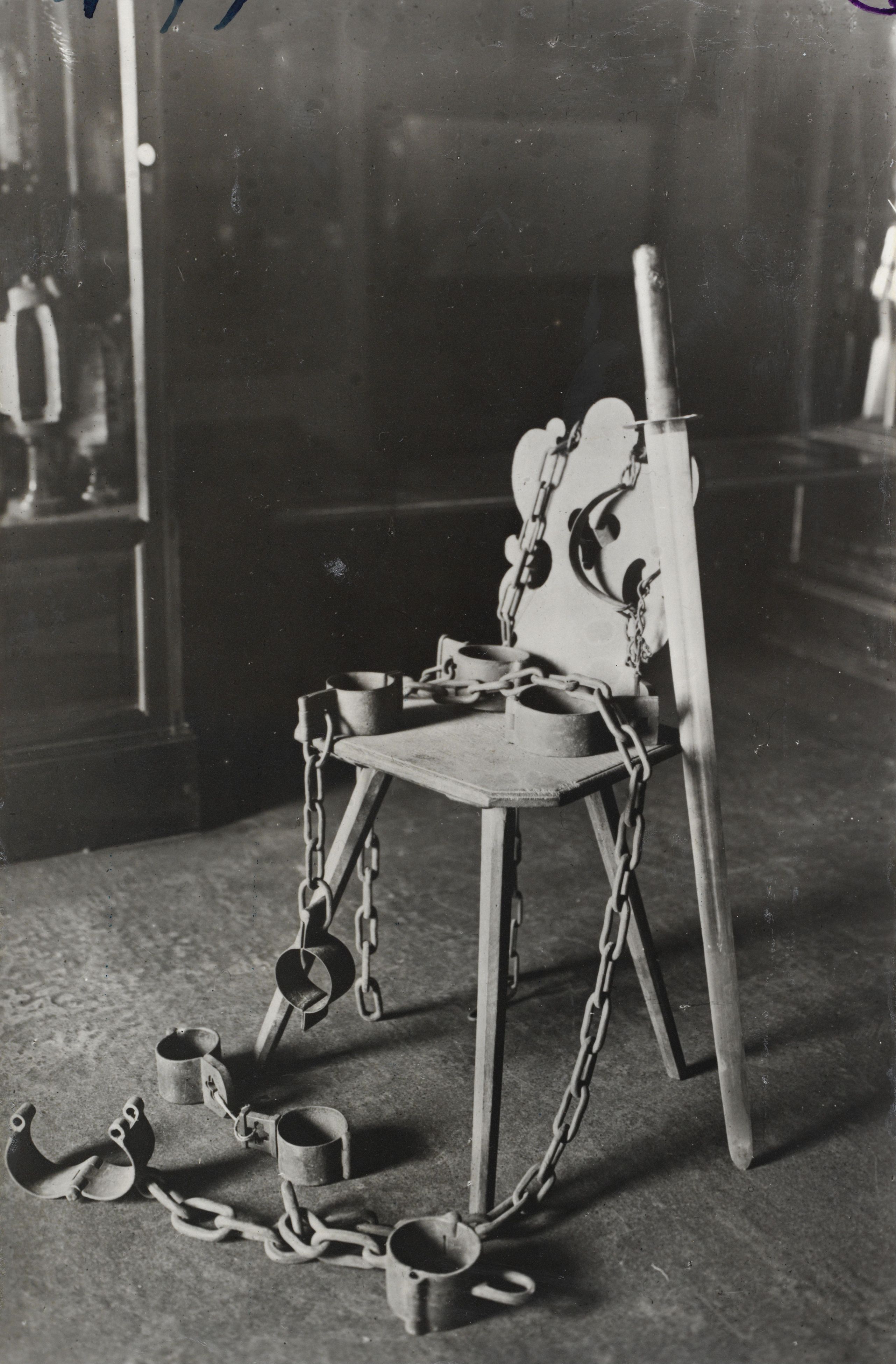 Auf der Karteikarte steht mit Schreibmaschine geschrieben: Strafen; Richtstuhl und Richtschwert. Historisches Museum Schloss Thun