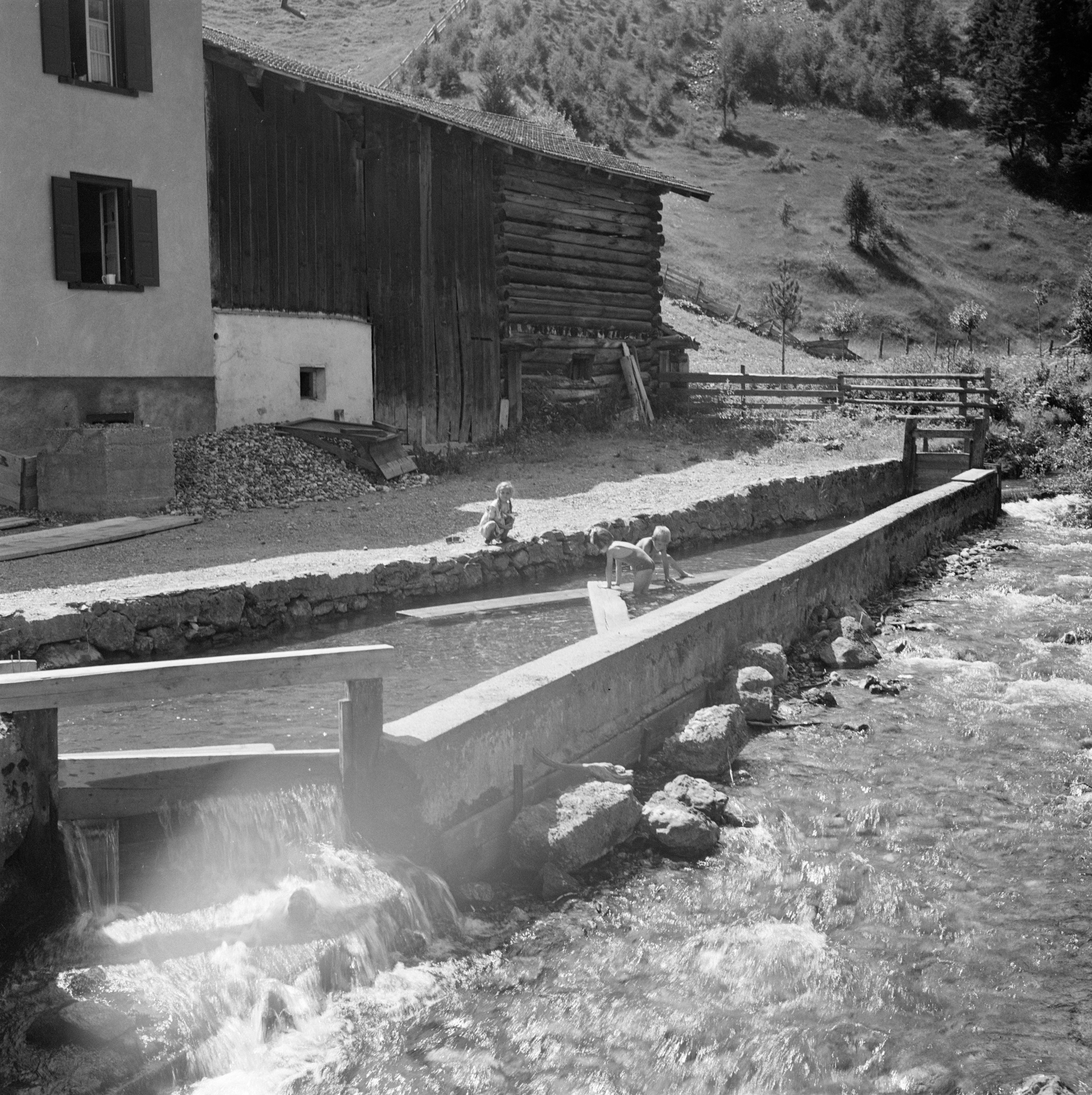 Auf der Positiv-Rückseite befindet sich folgende Notiz: 1947 Klosters; B 1303 E 1860a; Sandschwelle am Mönchalpbach zur Gewinnung von Sand; Photo Wildhaber.