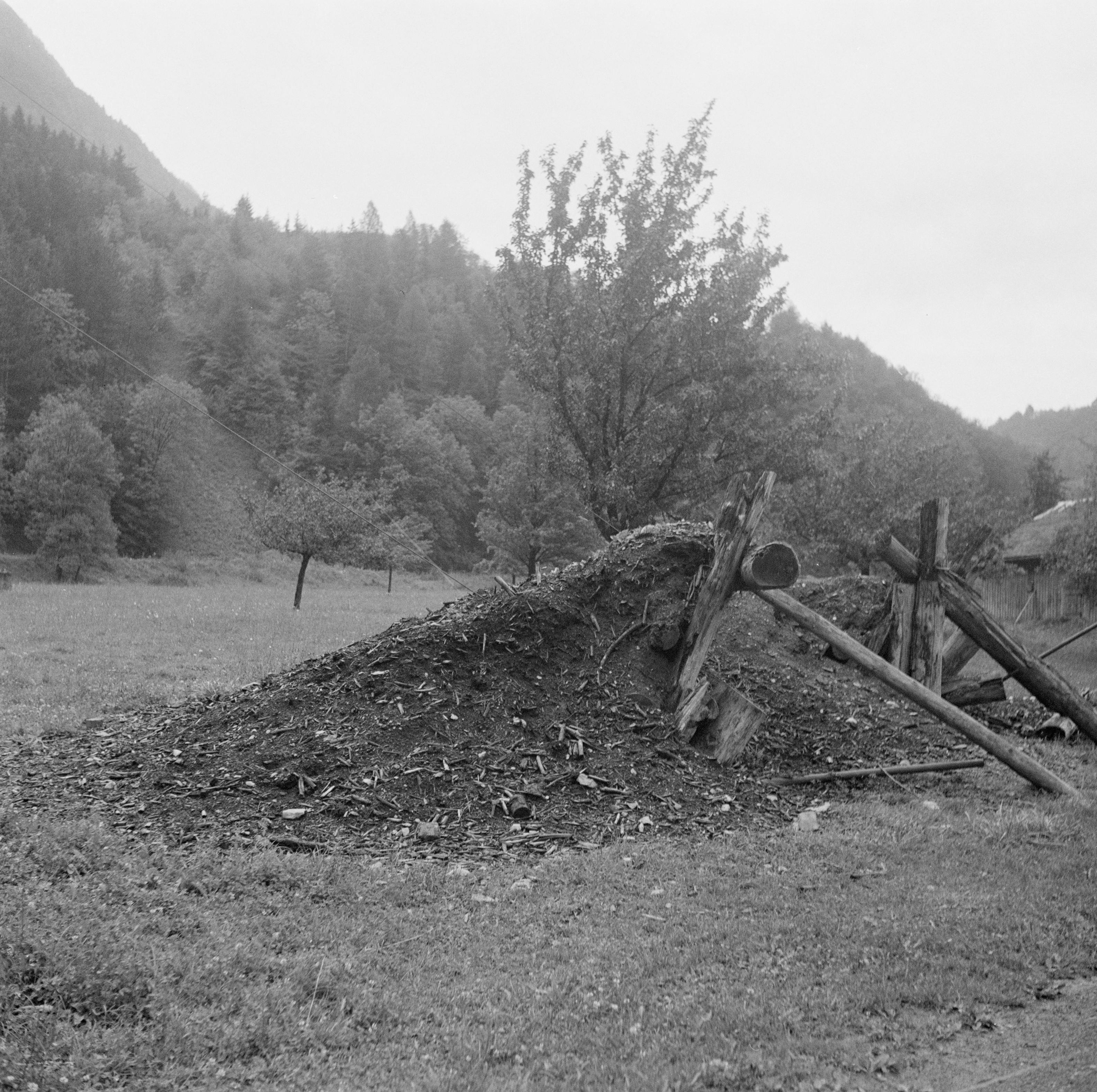 Auf der Positiv-Rückseite befindet sich folgende Notiz: Bärschis bei Wallenstadt; zwei alte Prellböcke für Holztransport am Drahtseil; B 1589 E 1731; Juli 48 Photo Wildhaber