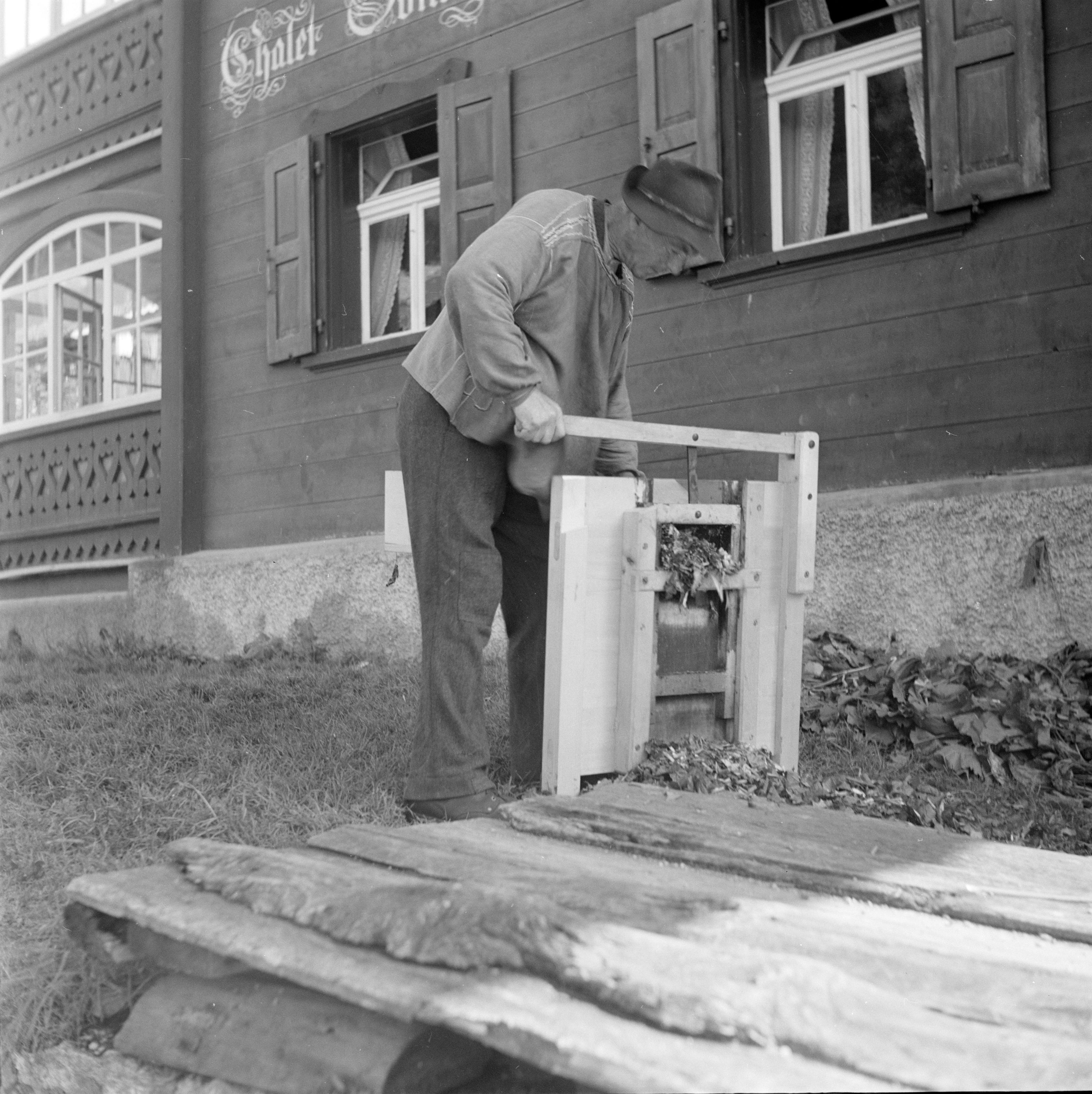 Auf der Positiv-Rückseite befindet sich folgende Notiz: 1947 Klosters; B 1341 a E 1720; Blacktenschneidmaschine; Photo Wildhaber