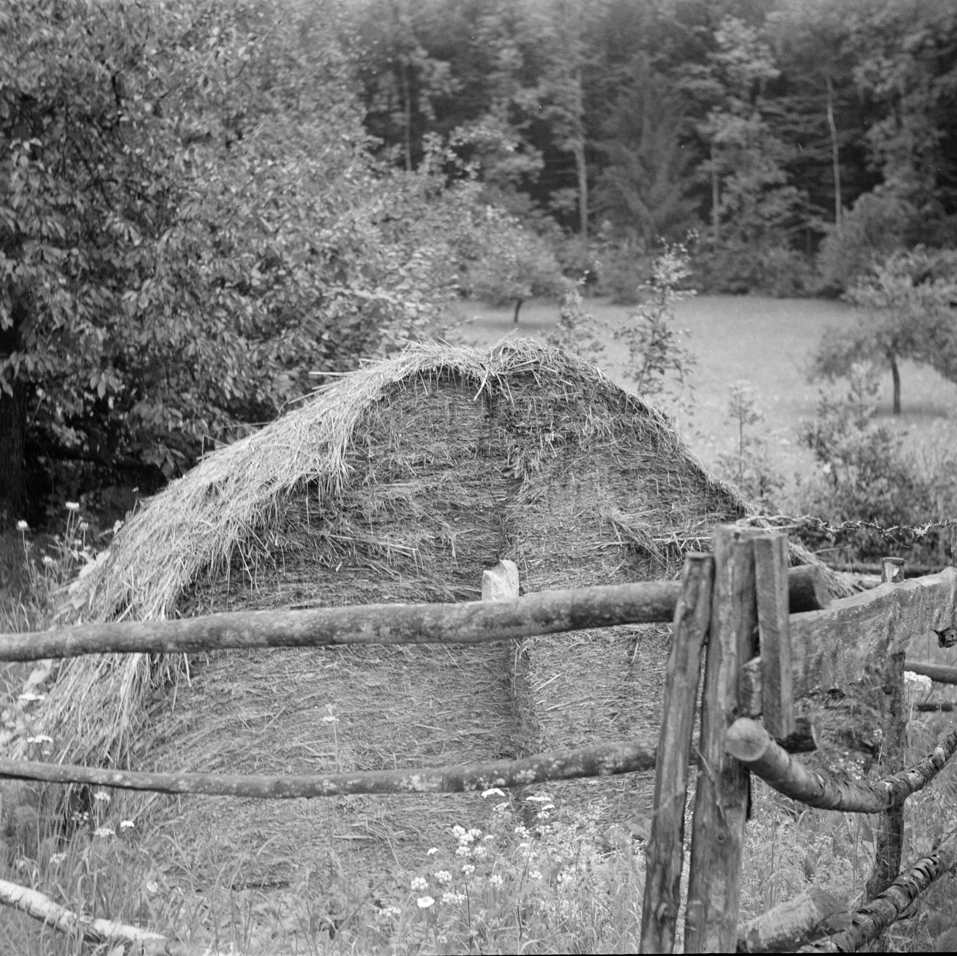 Auf der Positiv-Rückseite befindet sich folgende Notiz: bei Bärschis (bei Wallen-stadt) abgeschroteter Strohhaufen für Stallstreue; Vieh; B 1592 E 1597; Juli 48 Photo Wildhaber