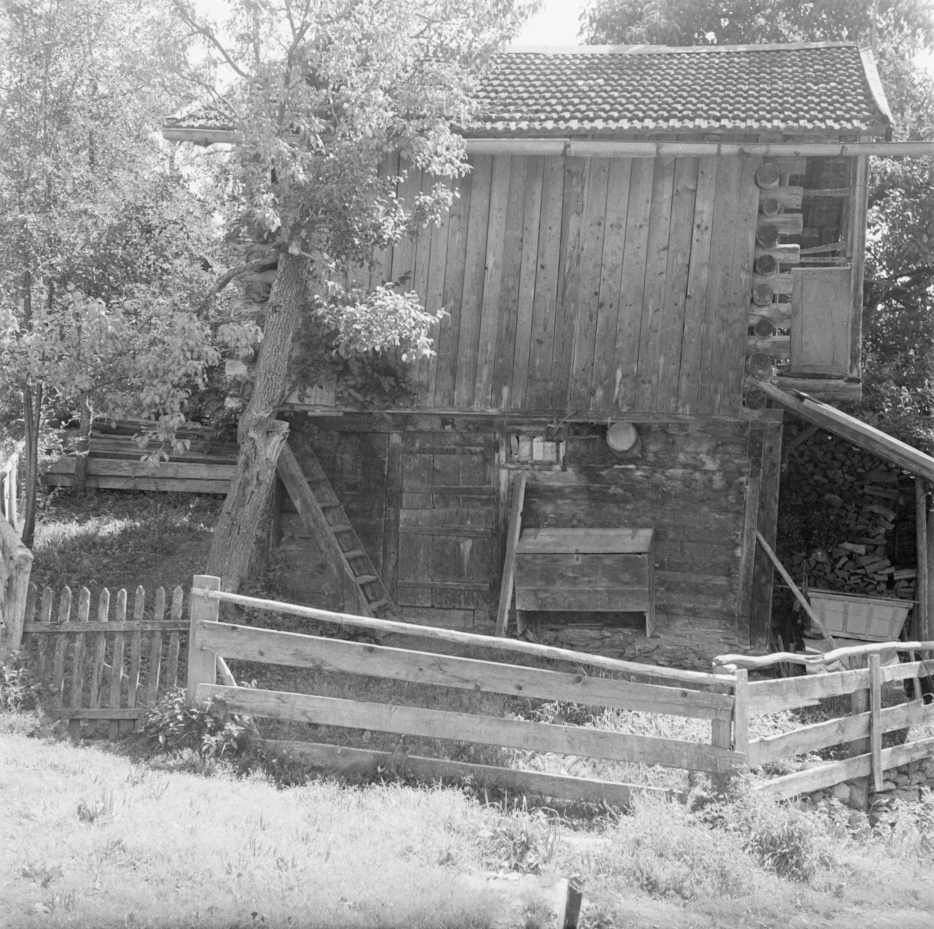 Auf der Positiv-Rückseite befindet sich folgende Notiz: Schleuis; Stall mit Korntrog und Scheune; E 1673; Getreide auf Bemalung [?]; B 1989; Photo Wildhaber 1949