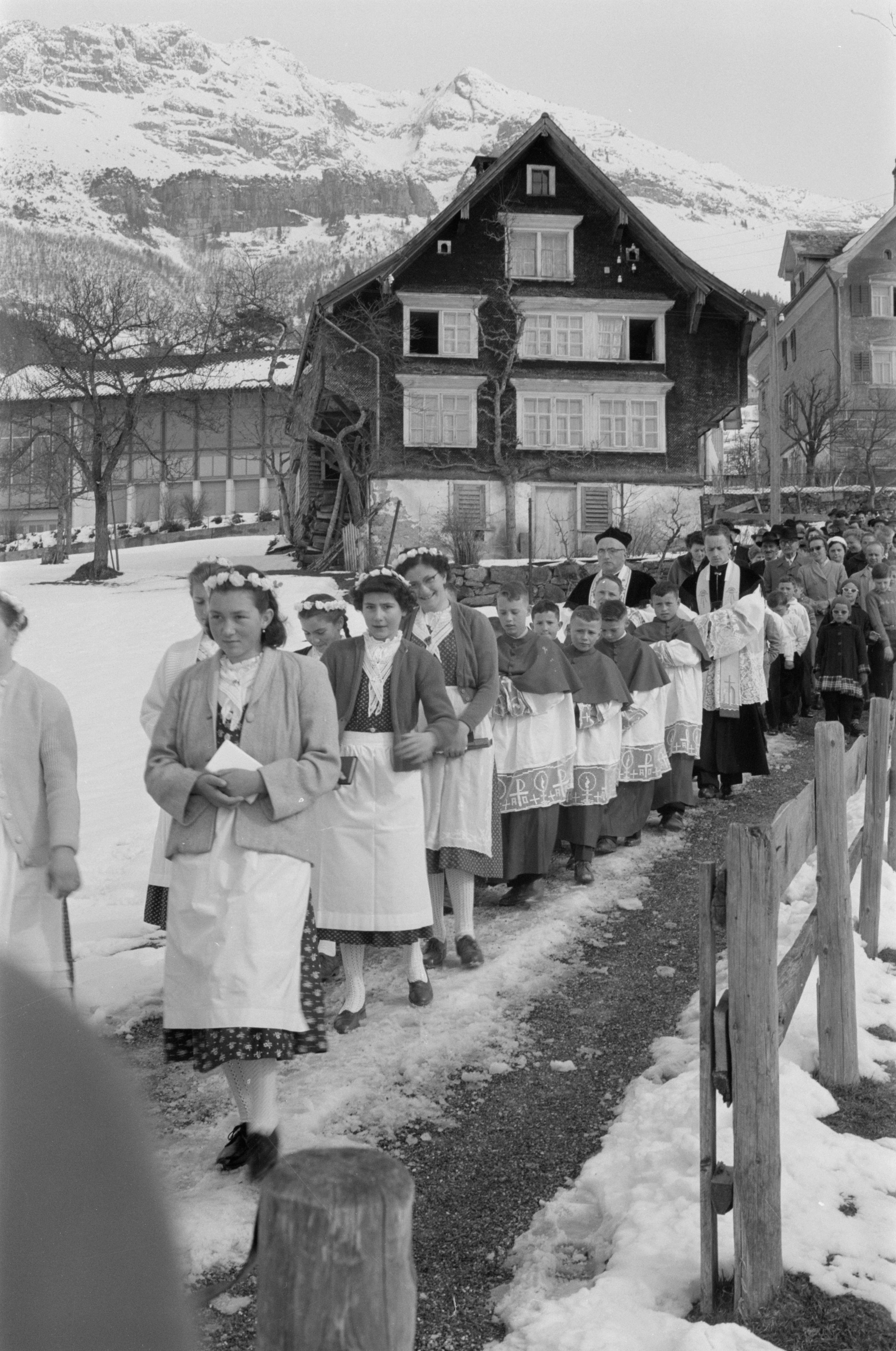 Auf der Karteikarte steht mit Schreibmaschine geschrieben: Weisser Sonntag, Grössere Schülerinnen in der St. Galler Arbeitstracht (Text s. P. Hugger, Amden, S. 154)