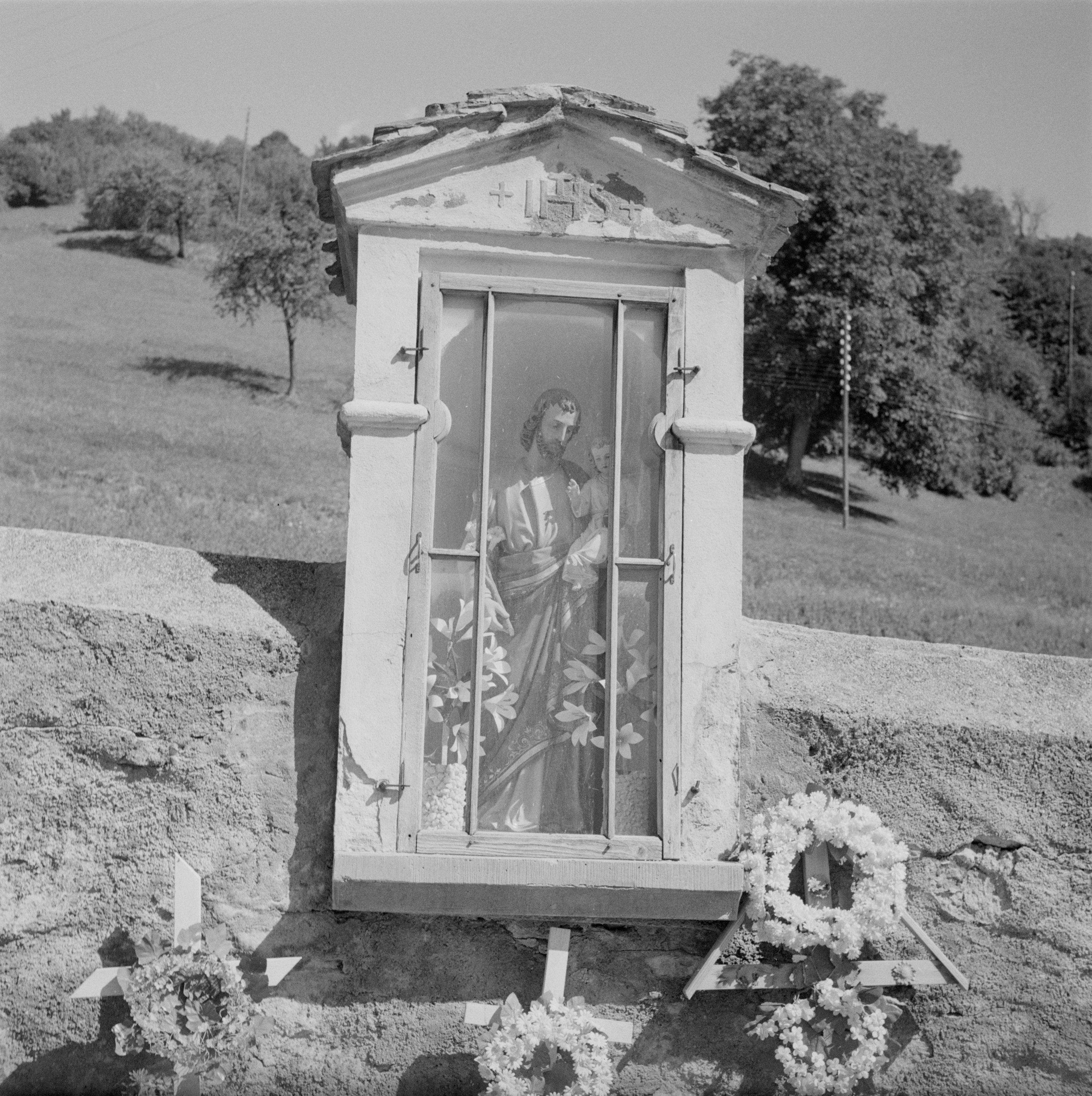Auf der Positiv-Rückseite befindet sich folgende Notiz: Schleuis; Bildstöcklein an der Friedhofsmauer; E 700 b B 1977; Photo Wildhaber 1949