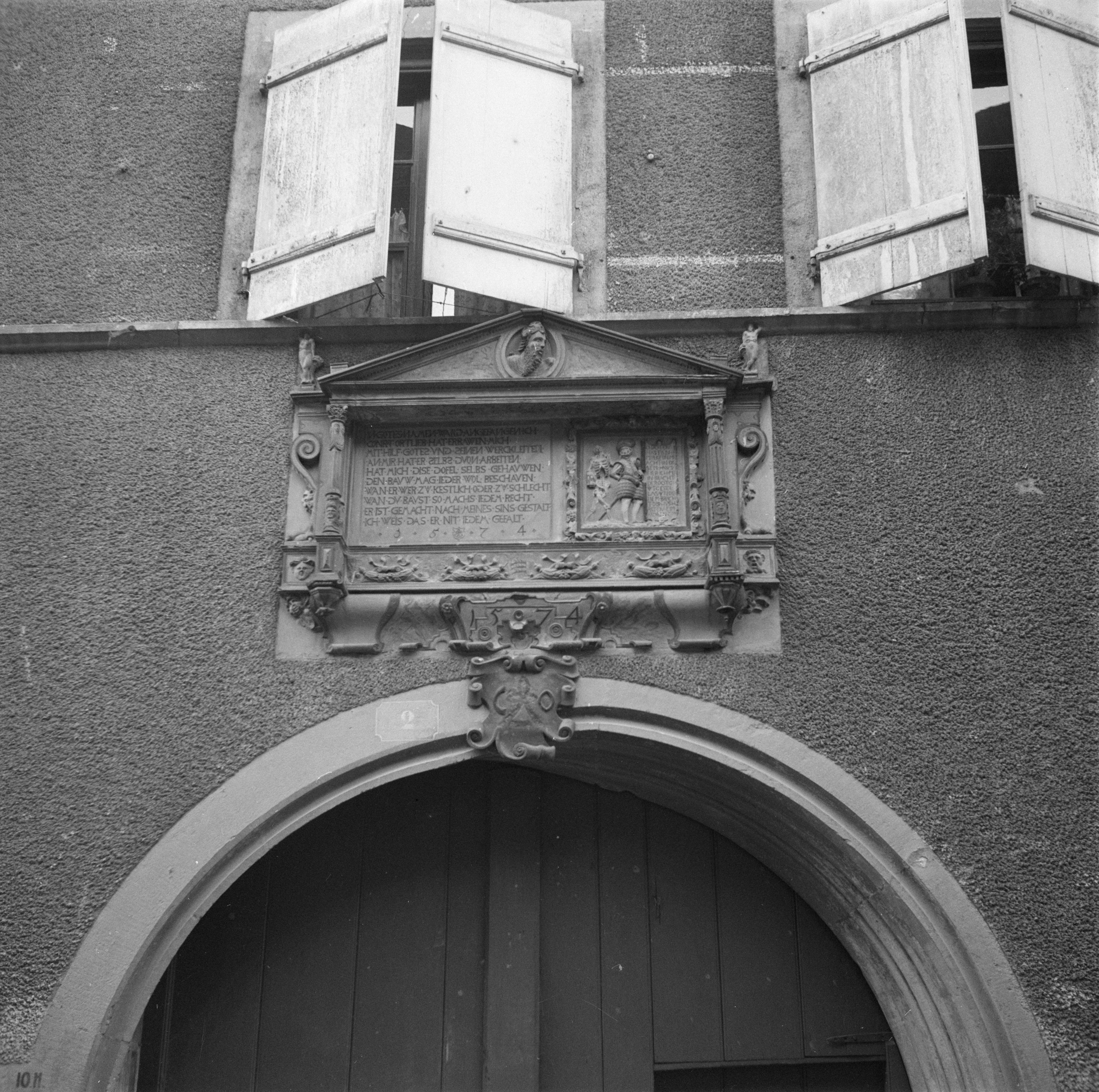 Auf der Karteikarte steht mit Schreibmaschine geschrieben: Totentanzrelief in Stein über Haustür