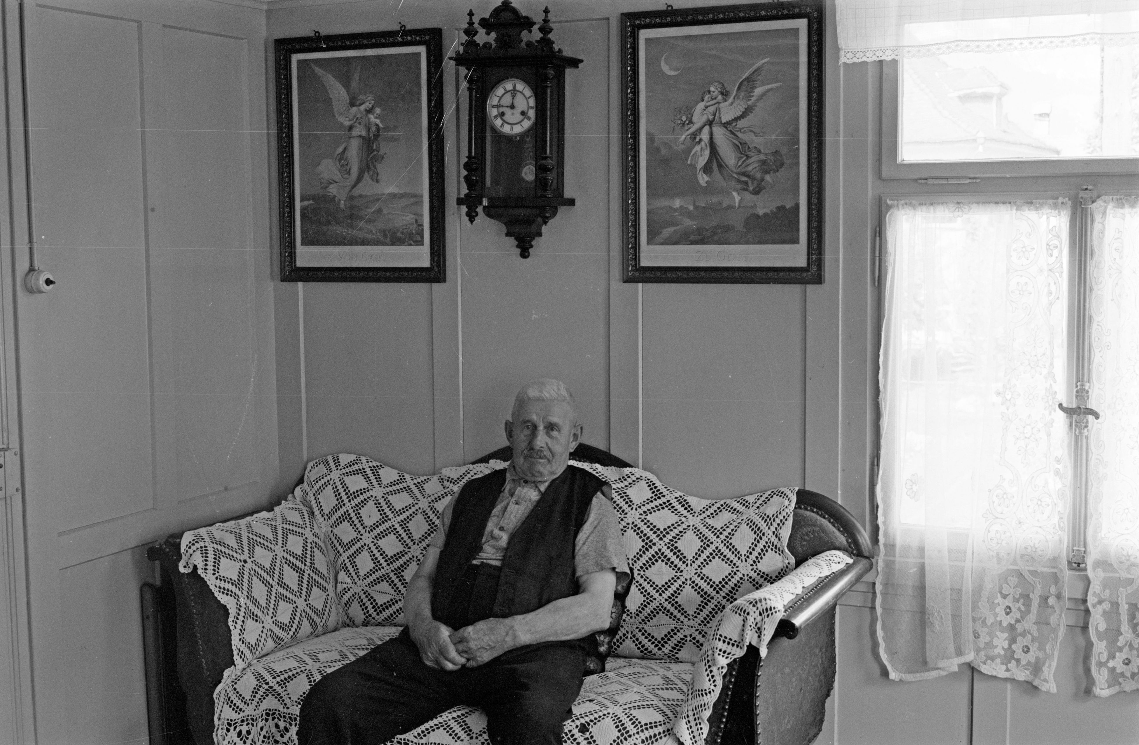 Auf der Positiv-Rückseite befindet sich folgende Notiz: 17; Buchsner Stube; 1961-63; Trauerbilder an den Wänden; B 2869 E 667 b