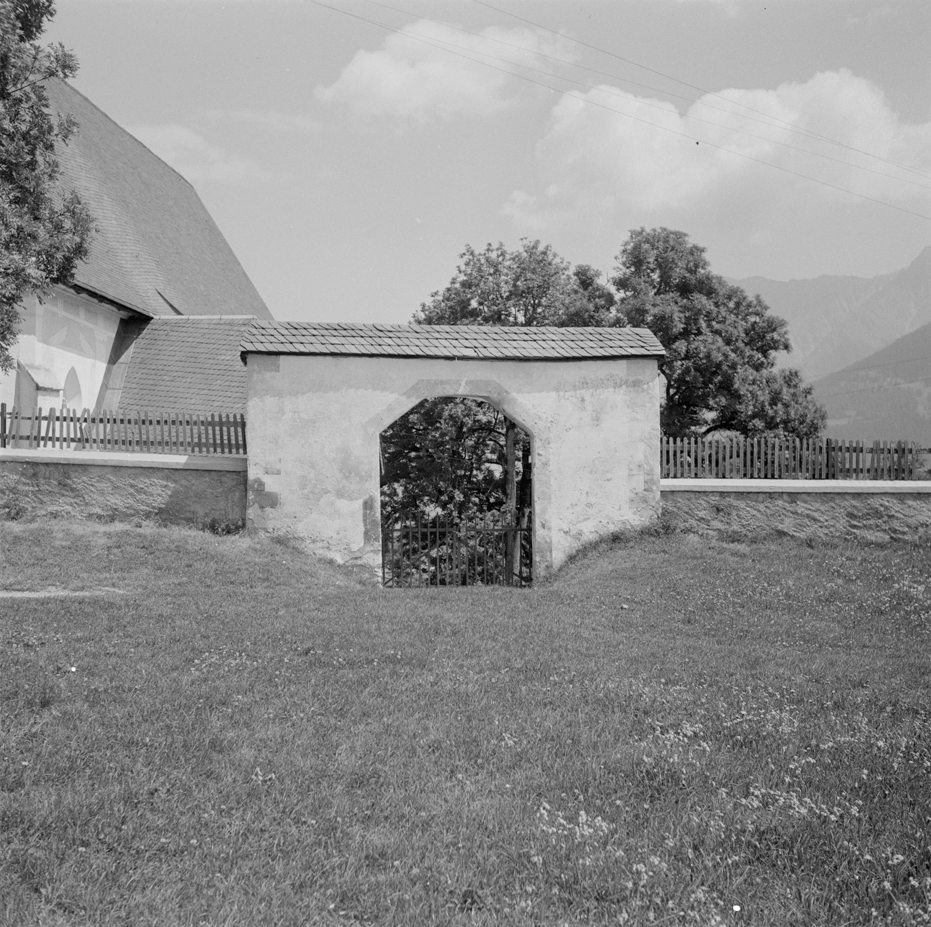 Auf der Positiv-Rückseite befindet sich folgende Notiz: Pleif (Lugnez); B 1929; Portal zum Friedhof; E 650 a; Photo Wildhaber 1949
