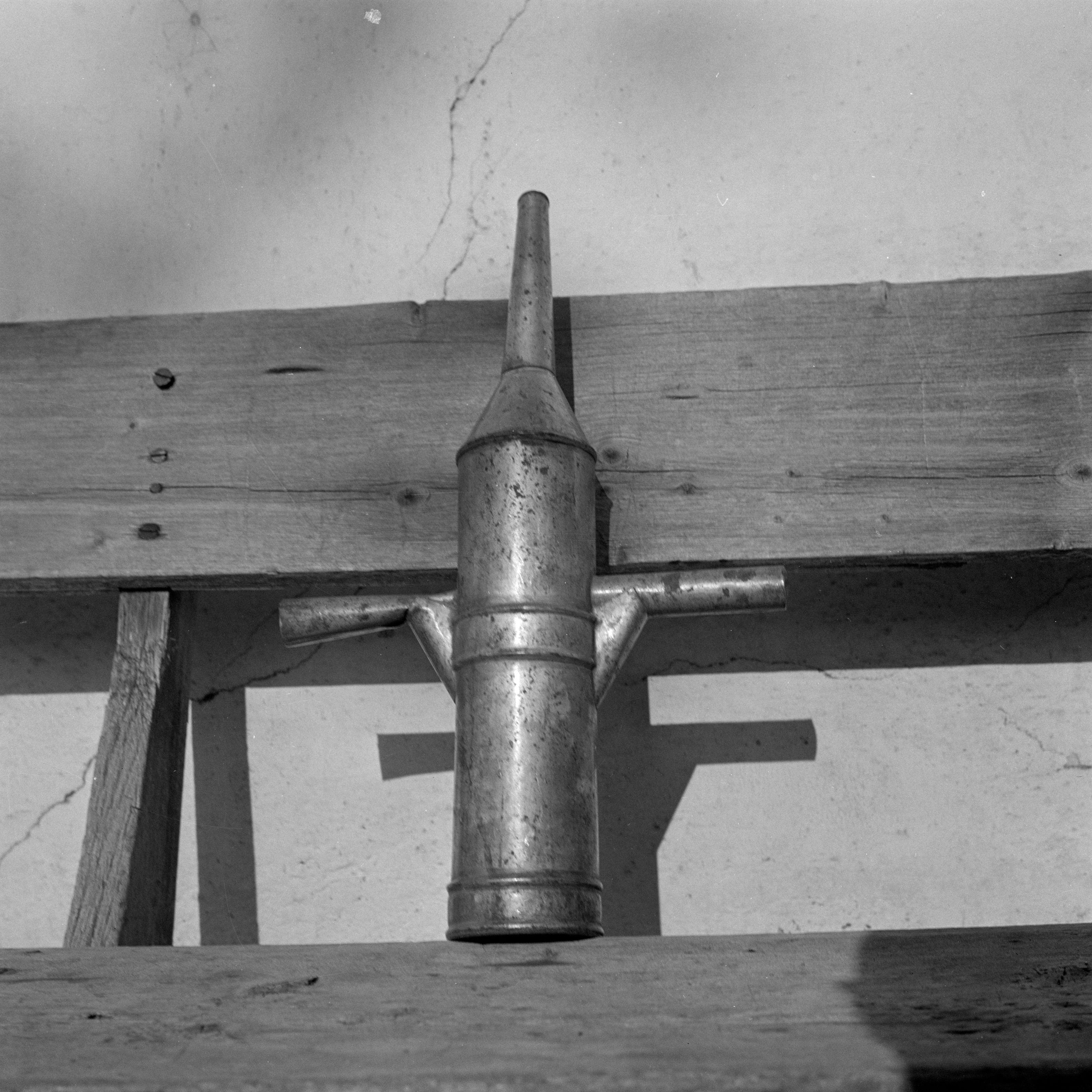Auf der Karteikarte steht mit Schreibmaschine geschrieben: Hausmetzgen; Wurstpresse (Museum für Volkskunde, Basel, VI 18211)