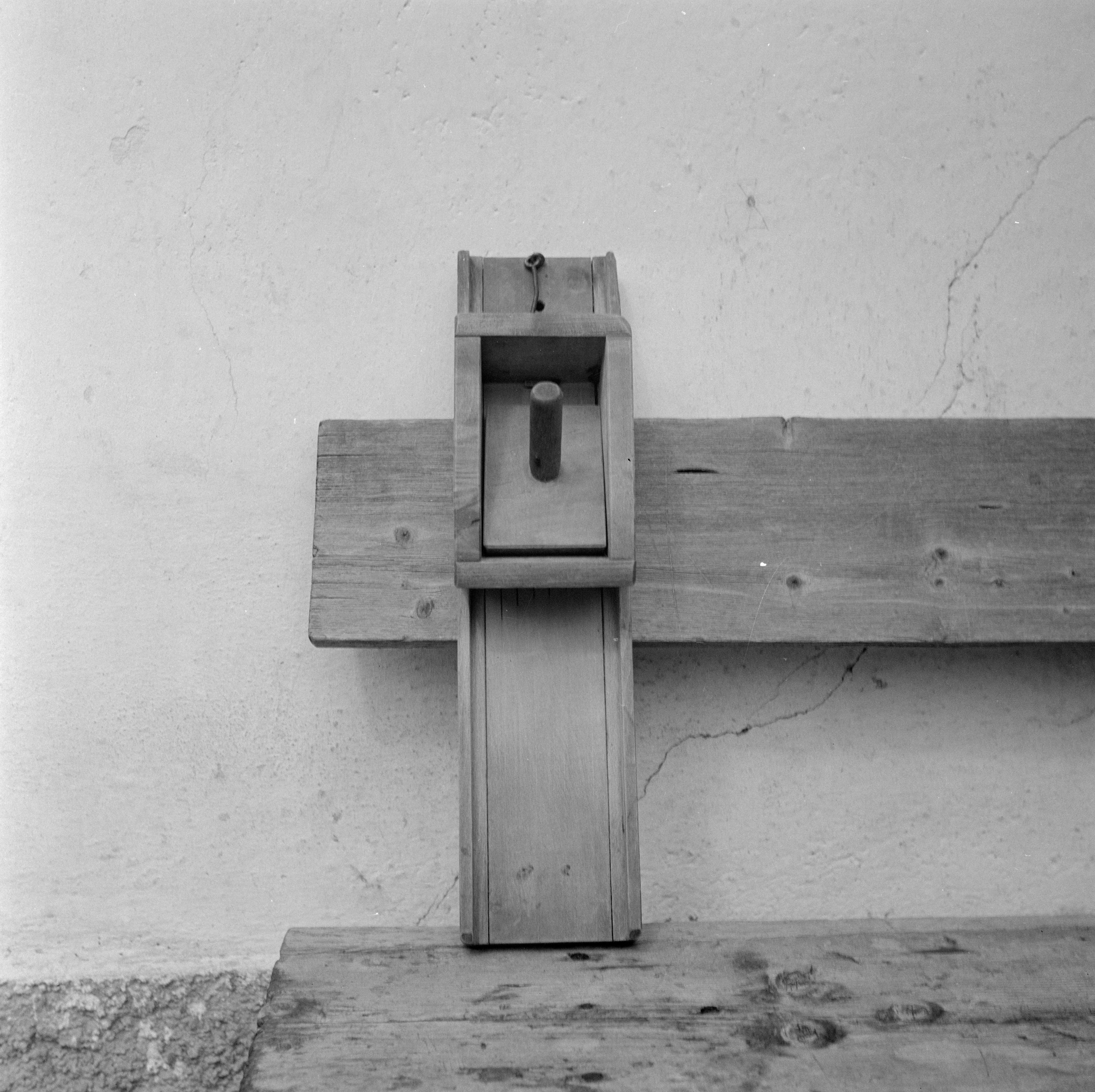 Auf der Karteikarte steht mit Schreibmaschine geschrieben: Birnenbrot; Gerät zur Herstellung; Birnenhobel für Birnbrot an Neujahr.