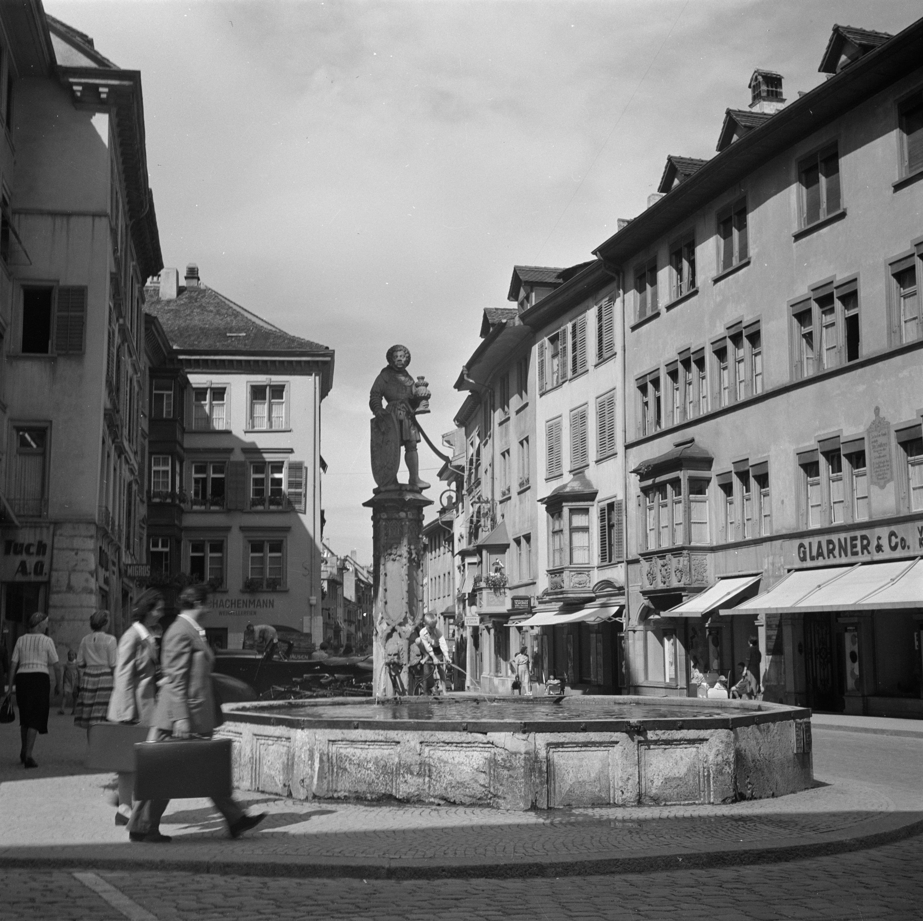 Auf der Karteikarte steht mit Schreibmaschine geschrieben: Brunnen; Mohrenbrunnen auf dem Fronwagplatz in Schaffhausen