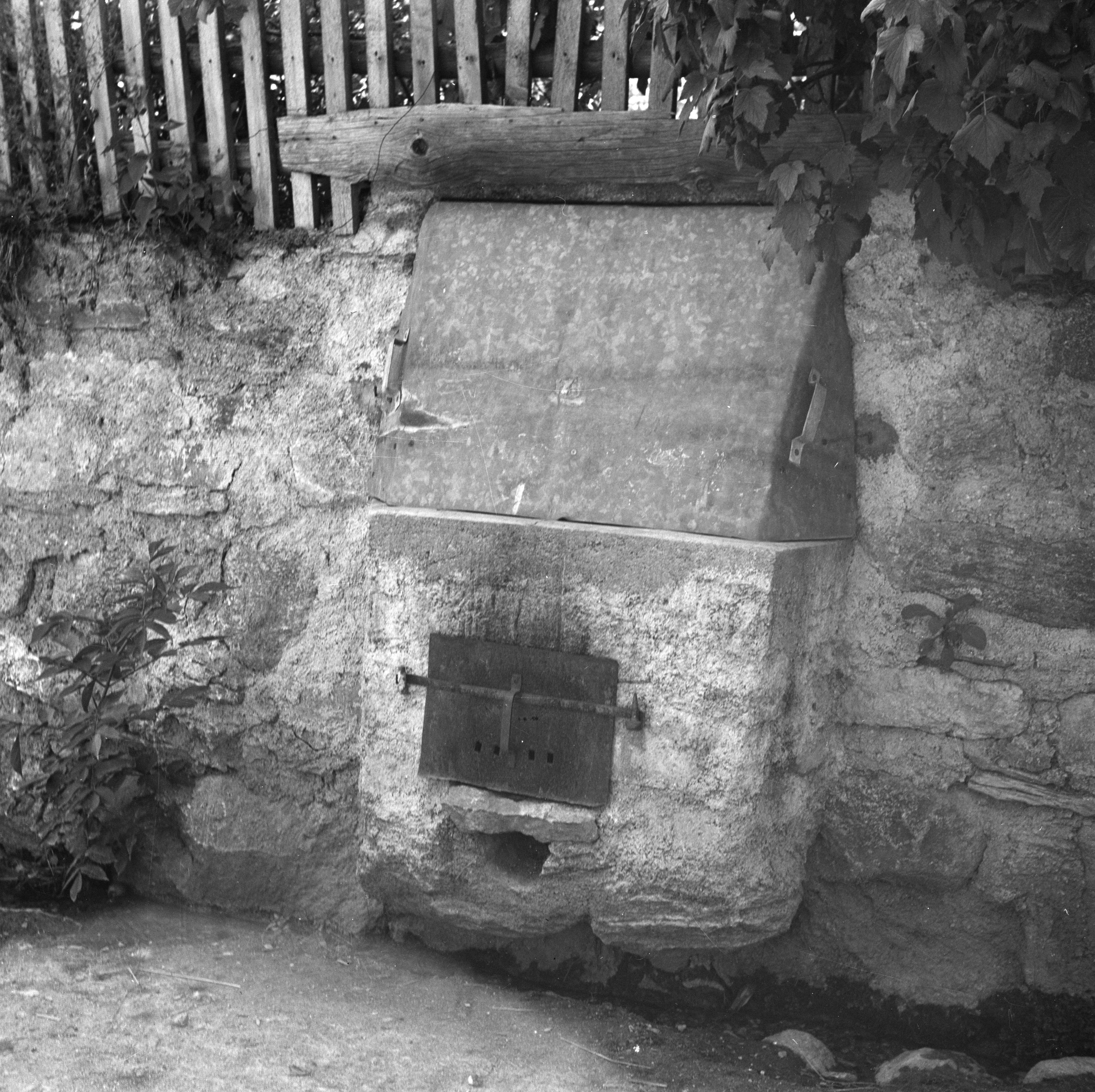 Auf der Karteikarte steht mit Schreibmaschine geschrieben: Backofen; Backhäuschen, in Gartenmauer gebaut.