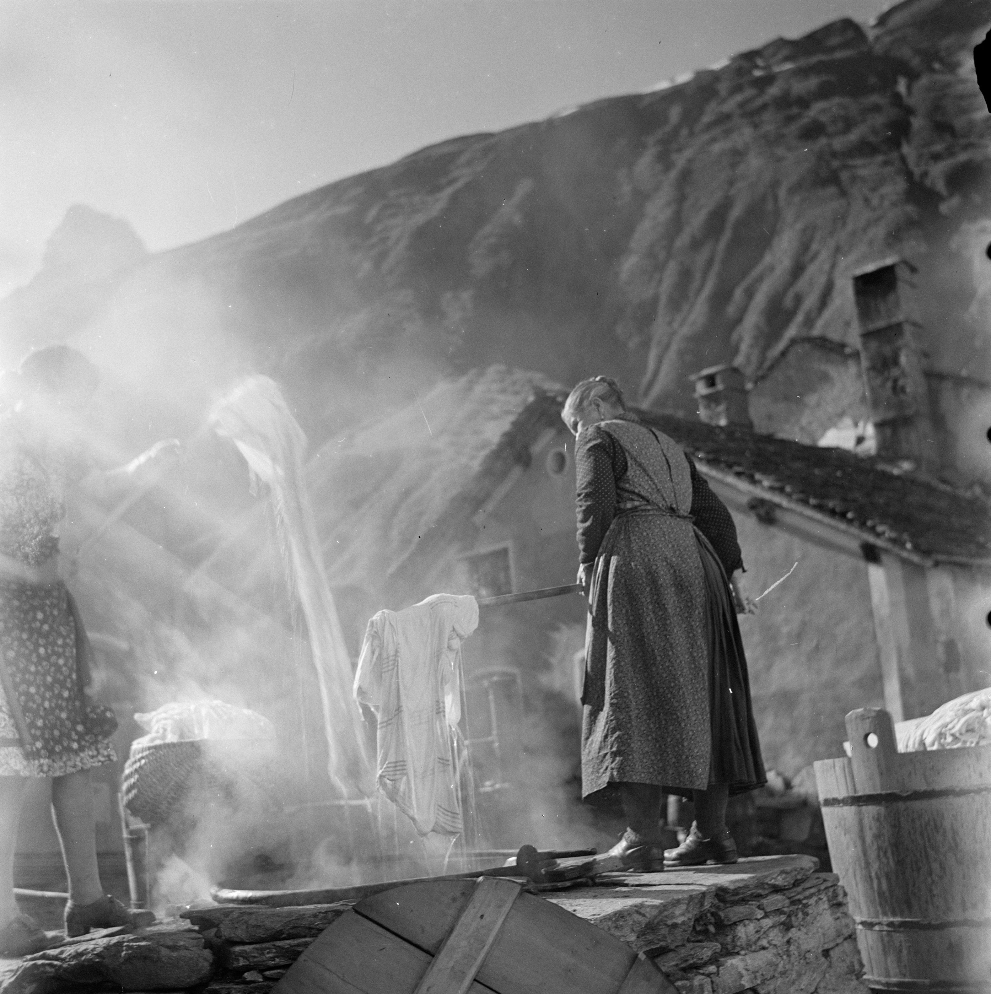 Auf der Karteikarte steht mit Schreibmaschine geschrieben: Wäsche; Mit einem langen Stecken wird die Wäsche aus dem heissen Spülwasser (nach dem "Buuchen") herausgezogen.