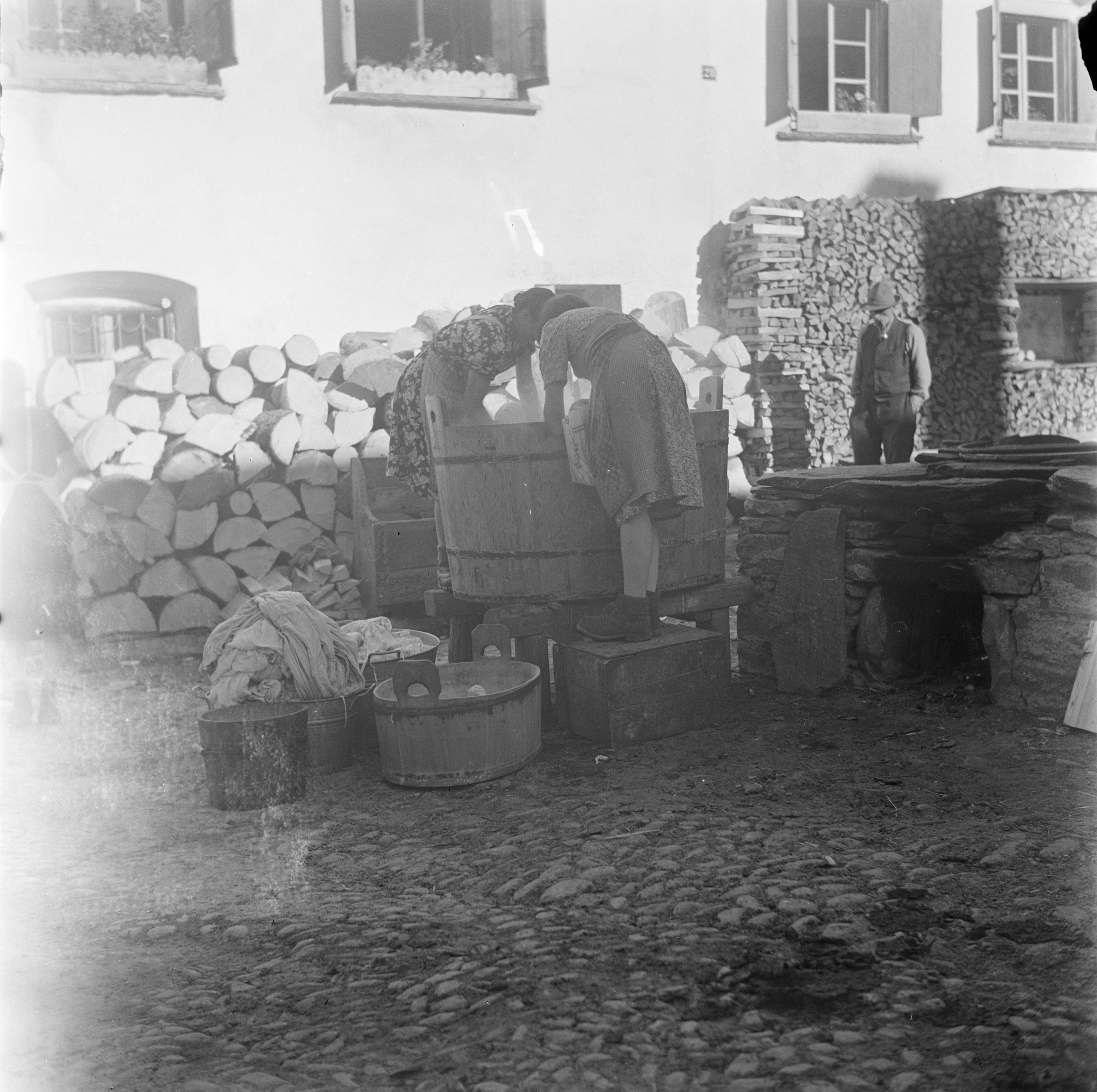 Fragebogen über die schweizerische Volkskunde: I. Haushalt und Hausleben; C. Arbeit; Frage 36: Wie ist die Art des Waschens? Frage 37: Wo wird gewaschen? Frage 38: Wann, wie oft im Jahr wird gewaschen? Frage 39: Wird die Wäsche auf irgend eine Art vorbereitet? Frage 40: Was für Geräte braucht man zur Wäsche. Wie nennt man sie?