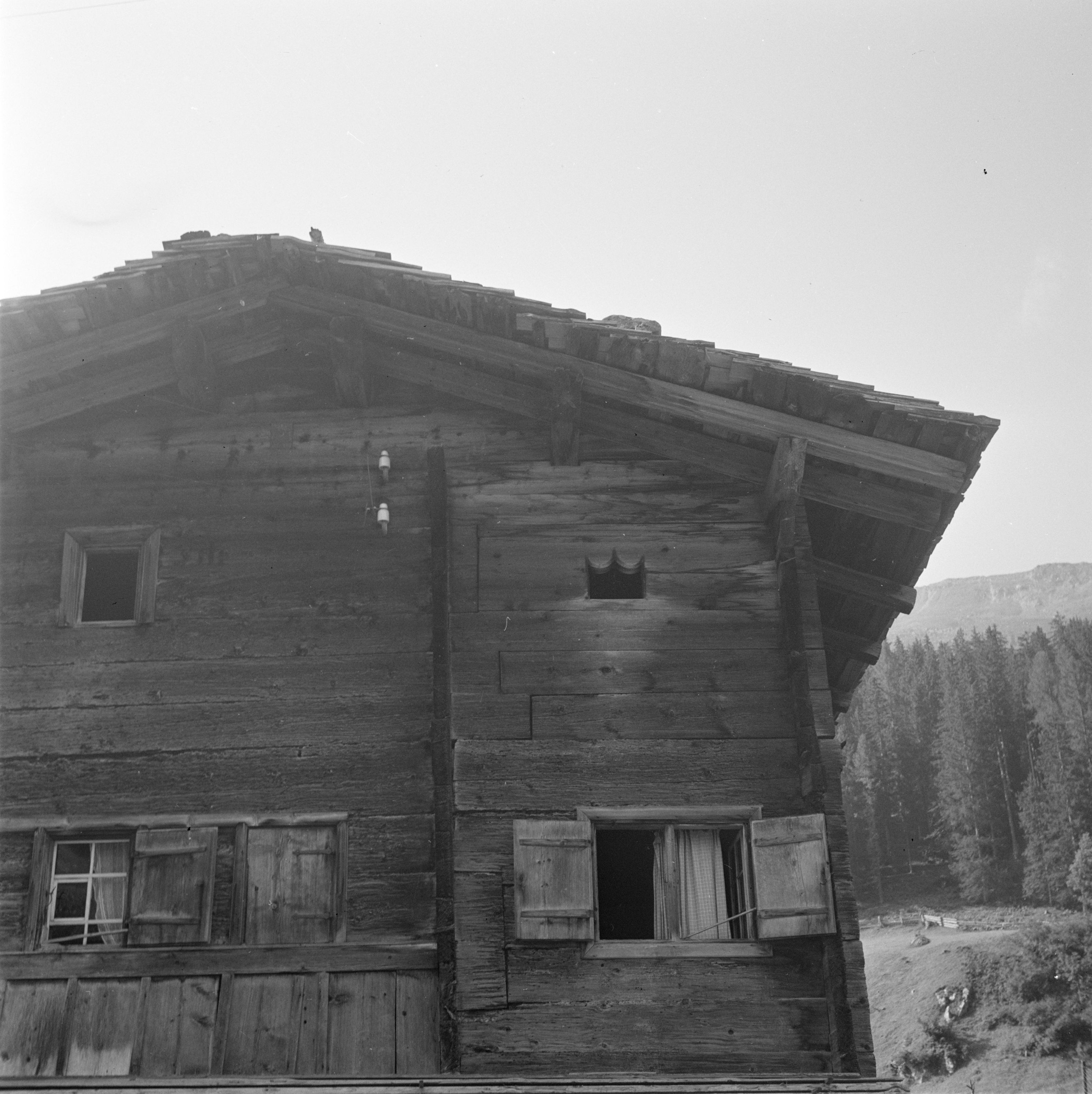 Auf der Karteikarte steht mit Schreibmaschine geschrieben: Bauernhaus; Haus mit eigenartigem Dachfensterlein (rechts)