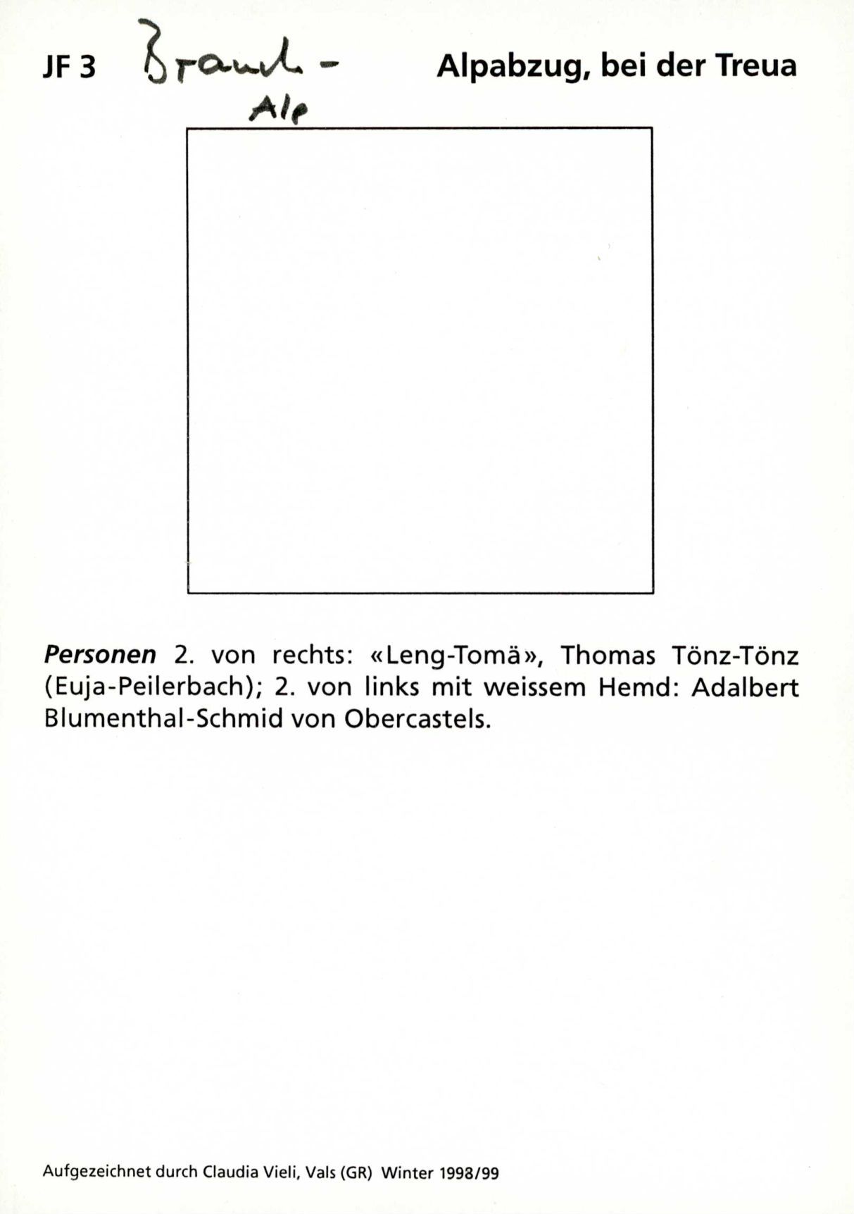 Auf der Vorderseite befindet sich folgende Notiz: JF 3 Brauch-Alp Alpabzug, bei der Treua Personen 2. von rechts: "Leng-Tomä", Thomas Tönz-Tönz (Euja-Peilerbach)
