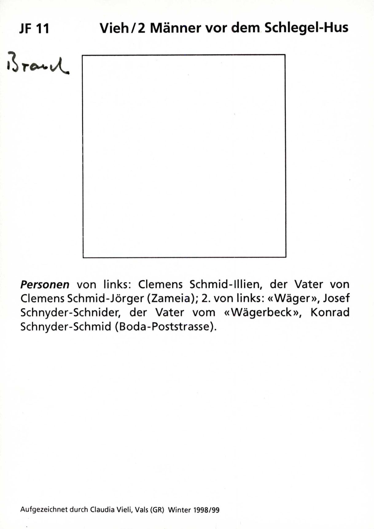 Auf der Vorderseite befindet sich folgende Notiz: JF 11 Vieh/2 Männer vor dem Schlegel-Hus Personen von links: Clemens Schmid-Illien, der Vater von Clemens Schmid-Jörger (Zameia)