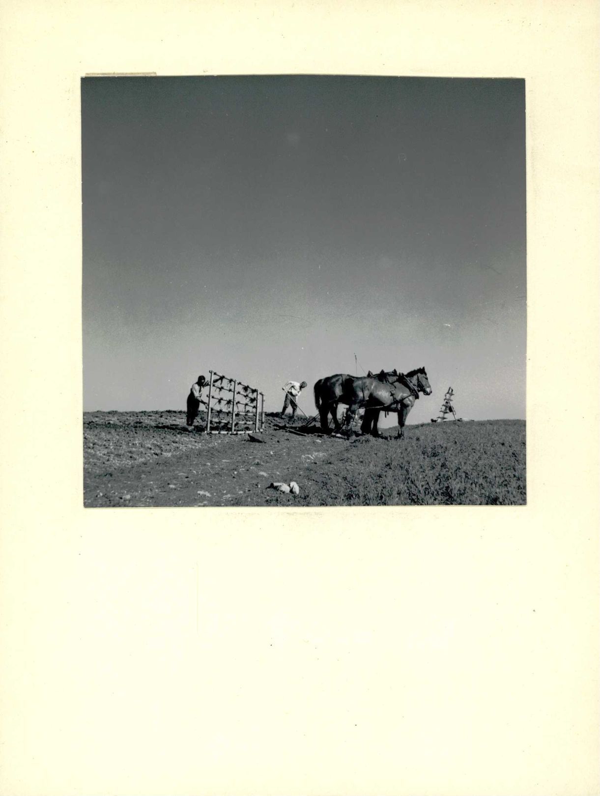 [Feldarbeit: Eggen mit einem dreispännigen Pferdegespann]