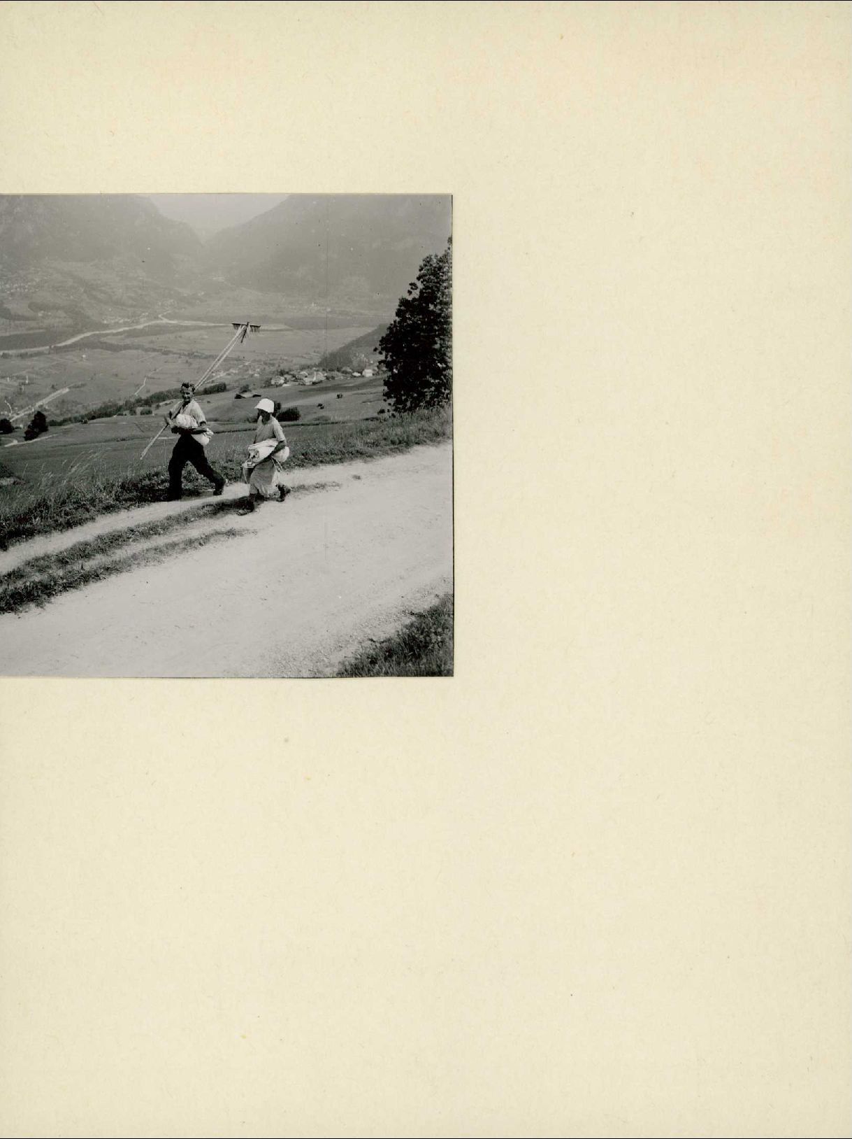 [Bauer und Bäuerin tragen Heurechen und Tücher]
