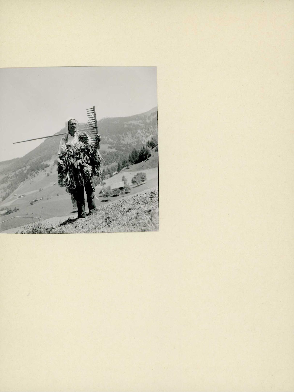 Auf der Rückseite befindet sich folgende Notiz: Arbeit Bauer Heu / Mit Seilrollen beladener Wildheuer Oberrickenbach Nidw. Oberrickenbach Ndw.