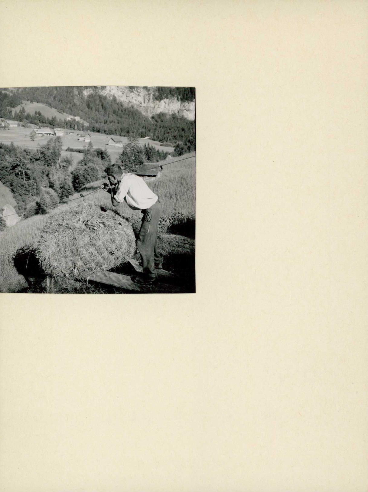 [Transport einer Heuballe über ein Drahtseil]