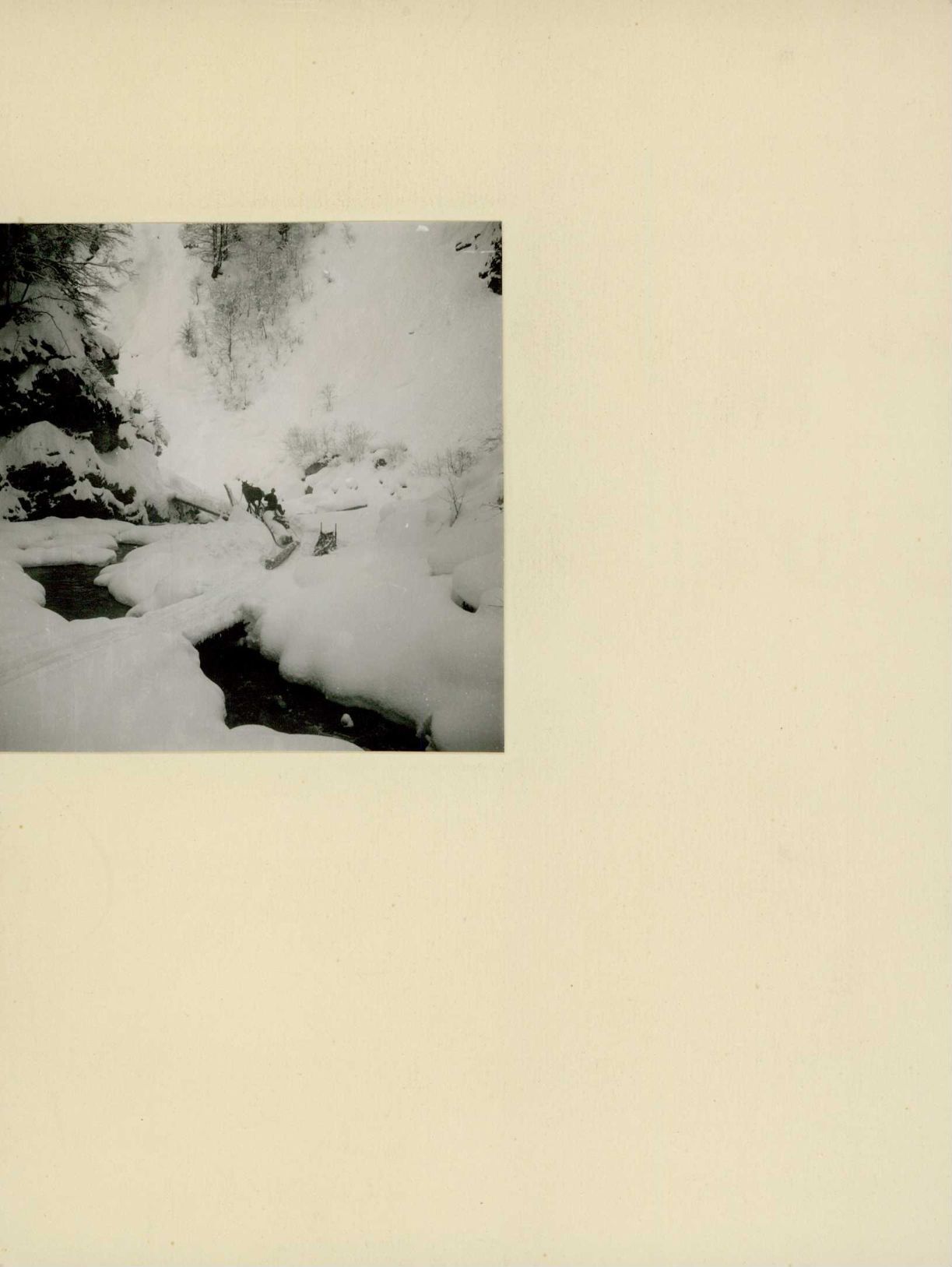 [Transport mit Pferdeschlitten durch verschneites Tal]