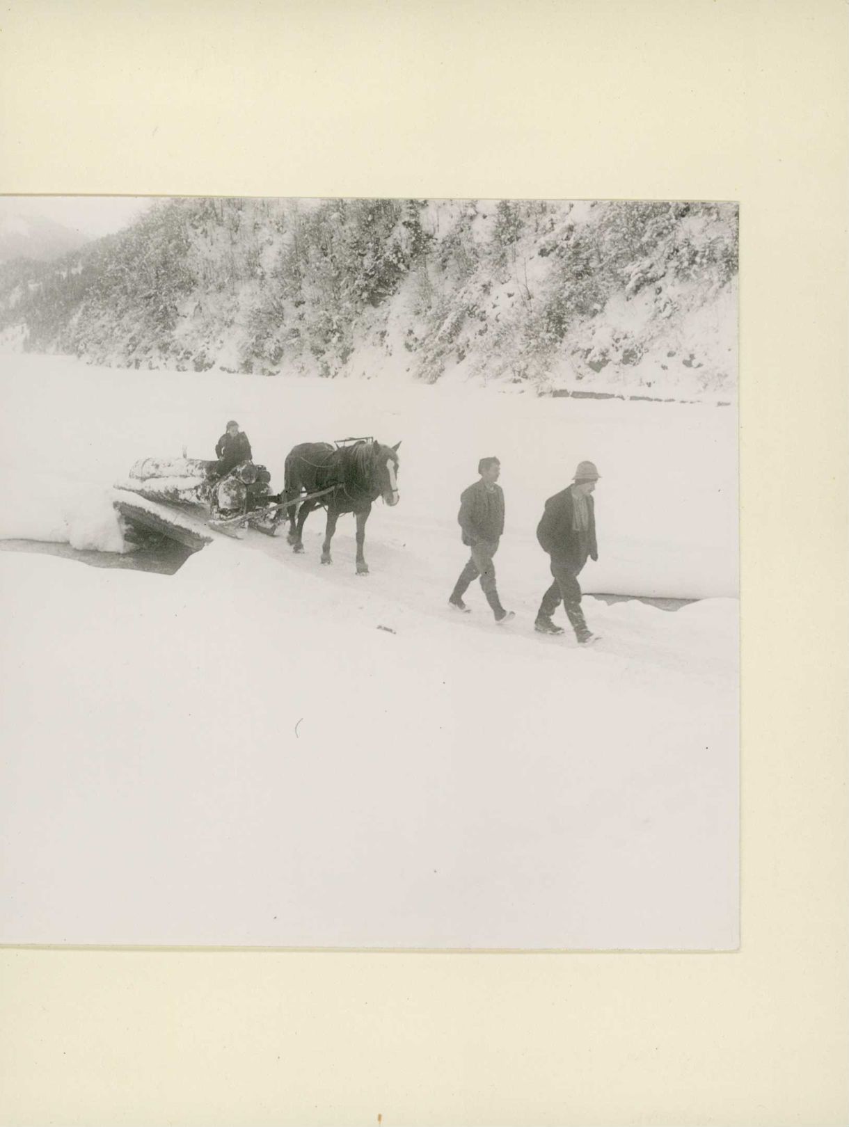 [Transport von Baumstämmen mit Pferdeschlitten]