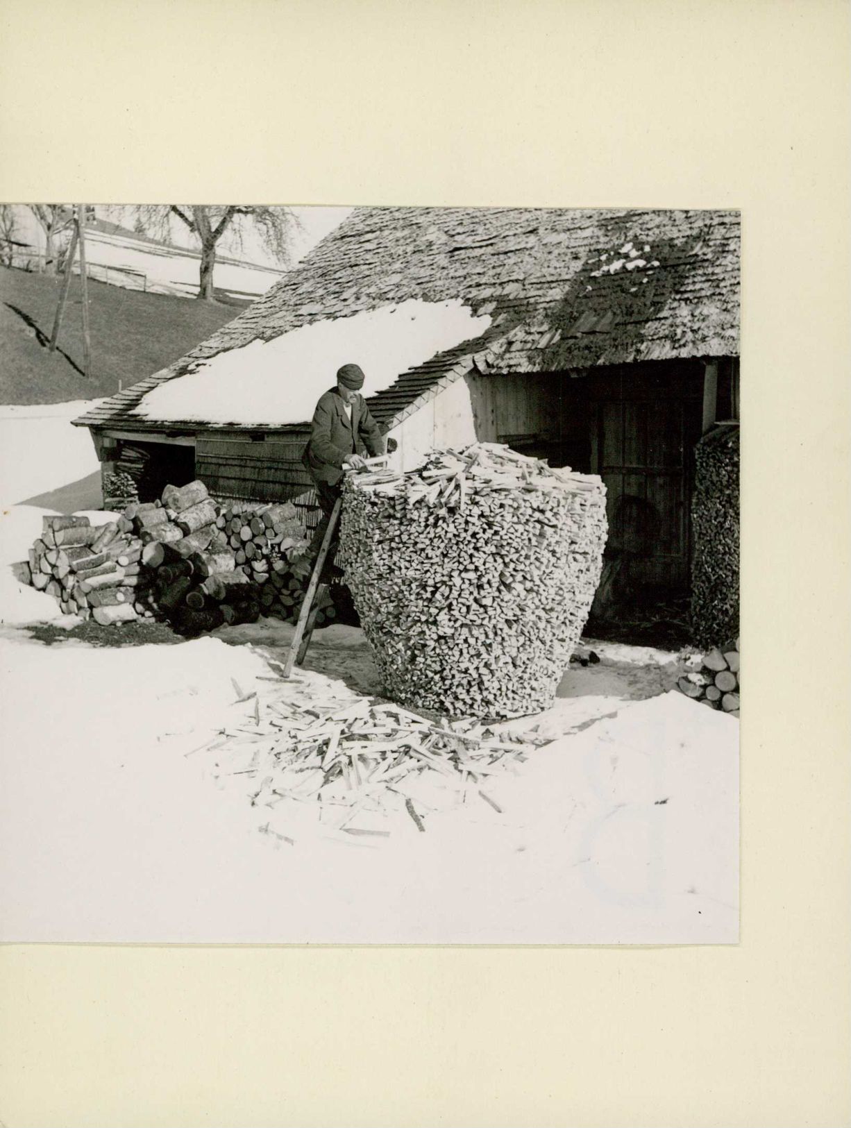 [Aufschichten von grossem Holzstapel]