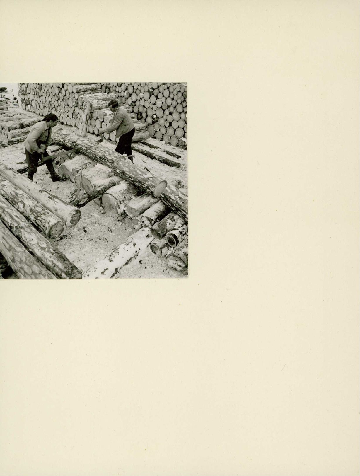 [Baumstämme werden zersägt und dann aufgeschichtet]