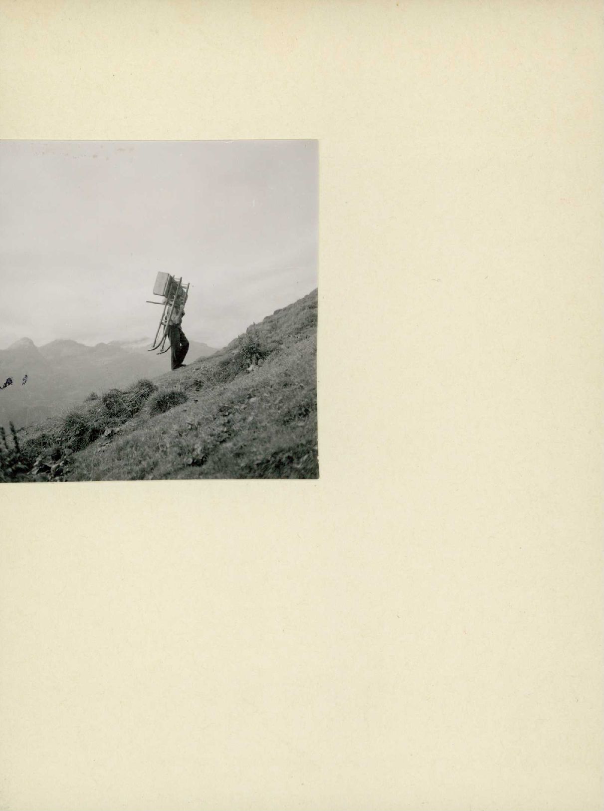 [Heinrich Tönz-Berni, einen Heuschlitten tragend]