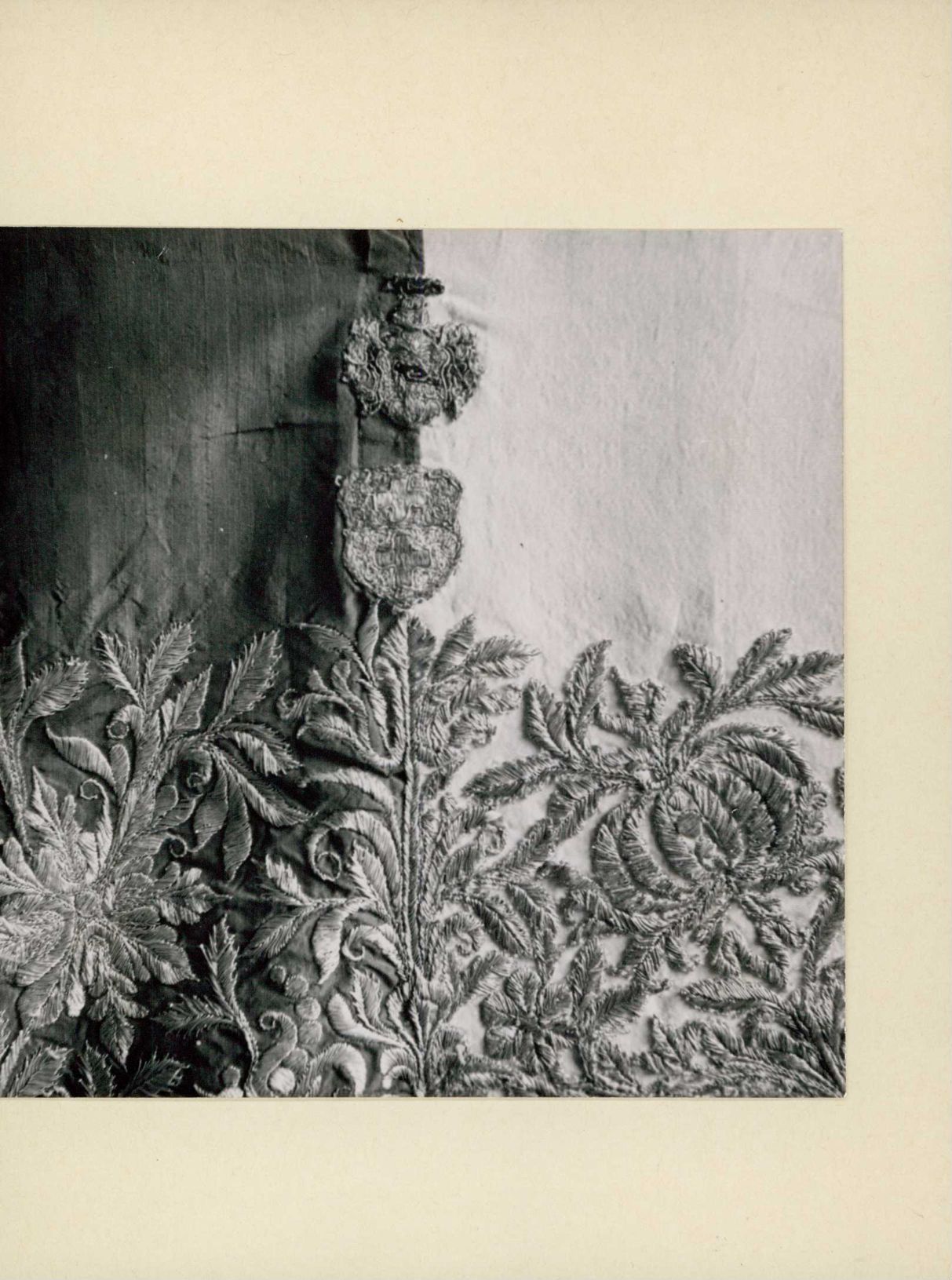 [Bestickte Tücher mit weissem und rotem Kreuz: Detailaufnahme]