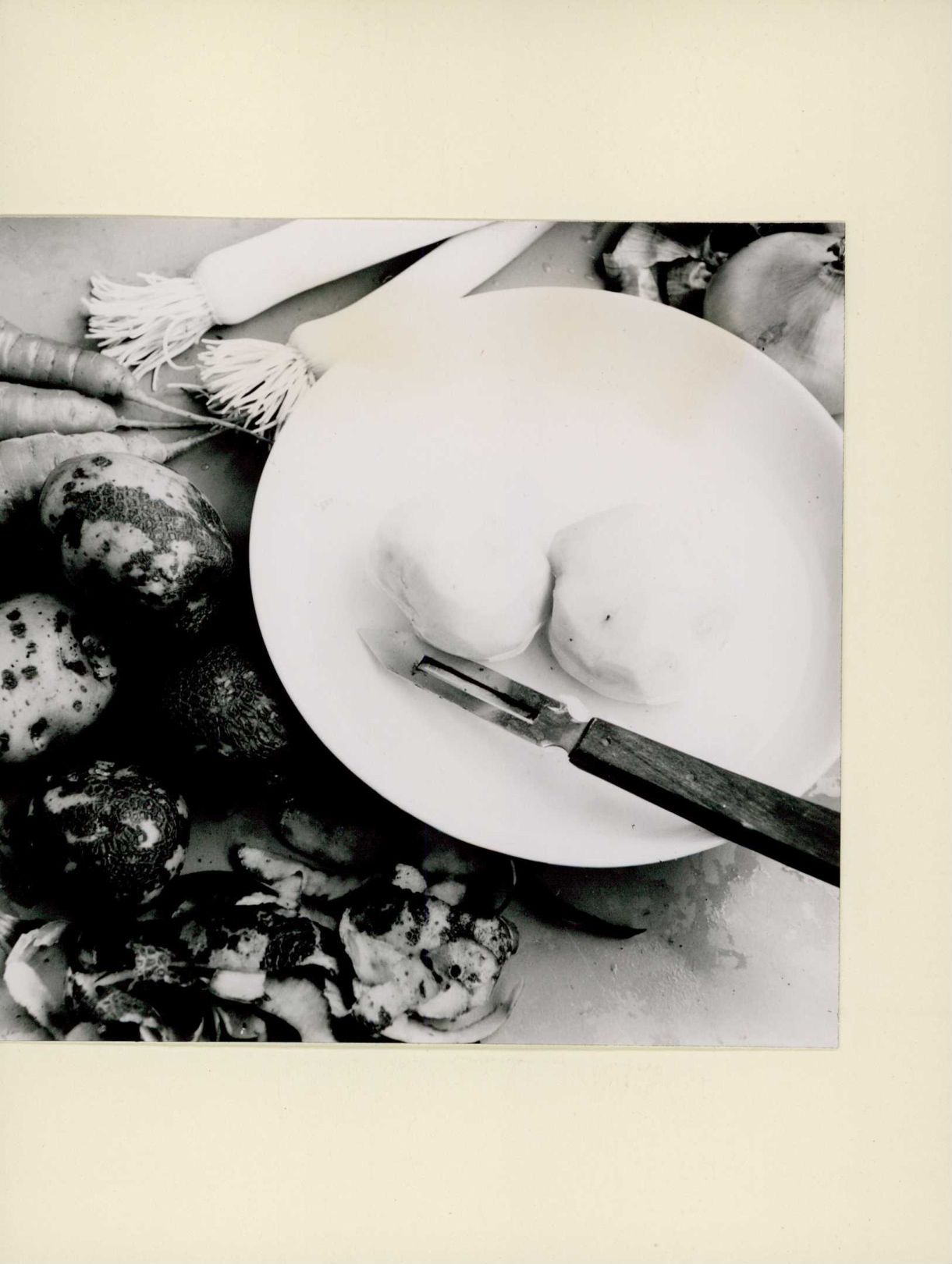 [Geschälte Kartoffeln neben Gemüse]
