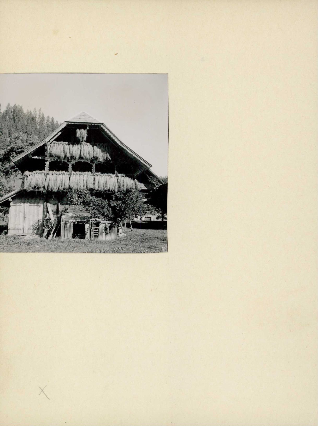 [Flachs zum Trocknen an Hauswand aufgehängt]