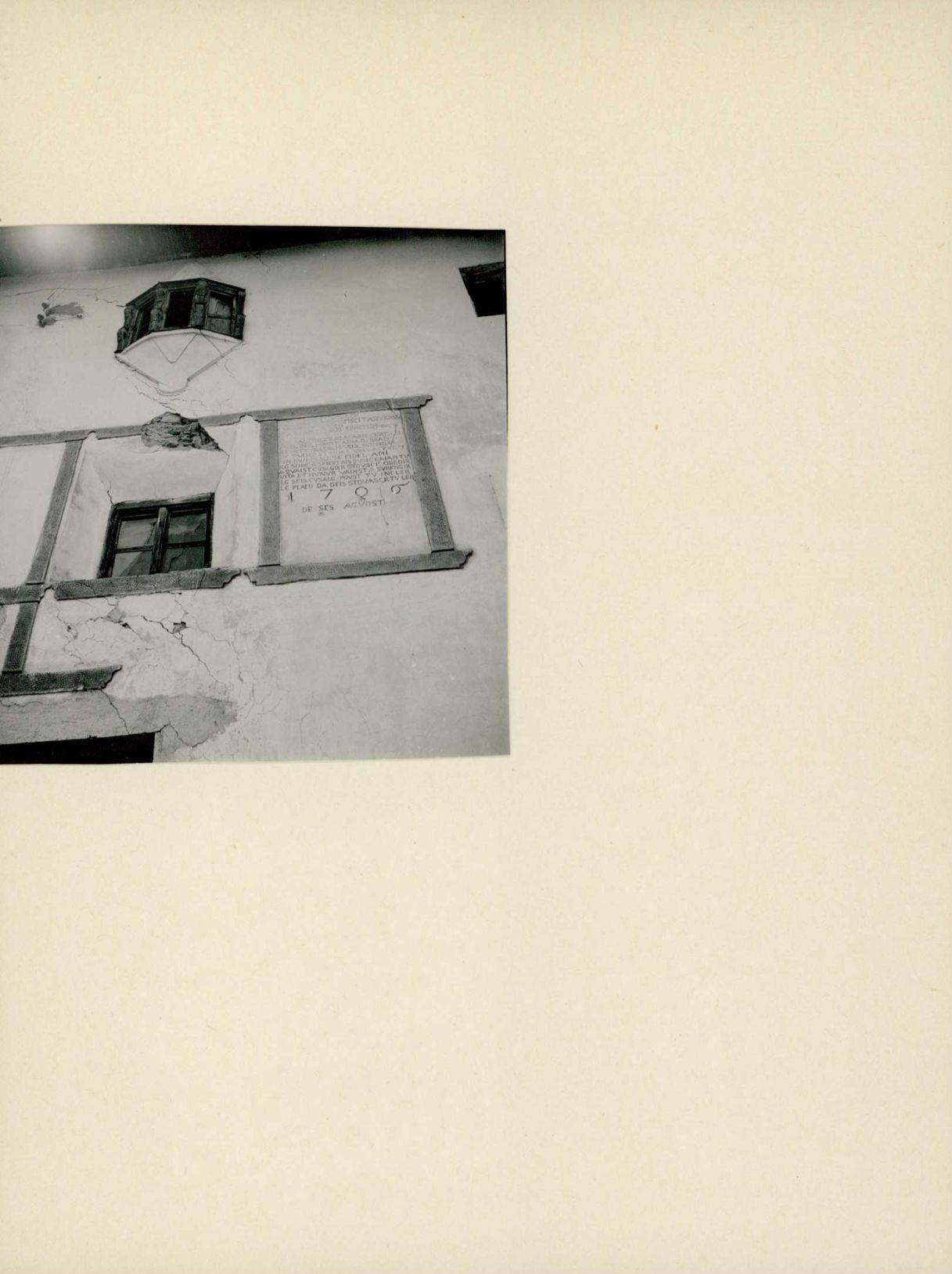 [Hauswand mit Sgraffiti und kleinem Fenstererker]