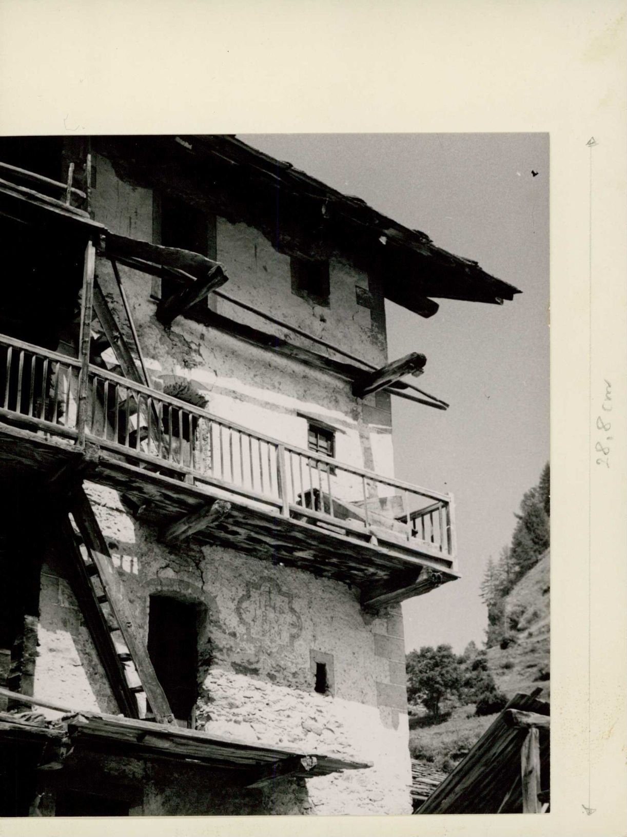 [Steinhaus mit Holzlaube und Holzleiter]