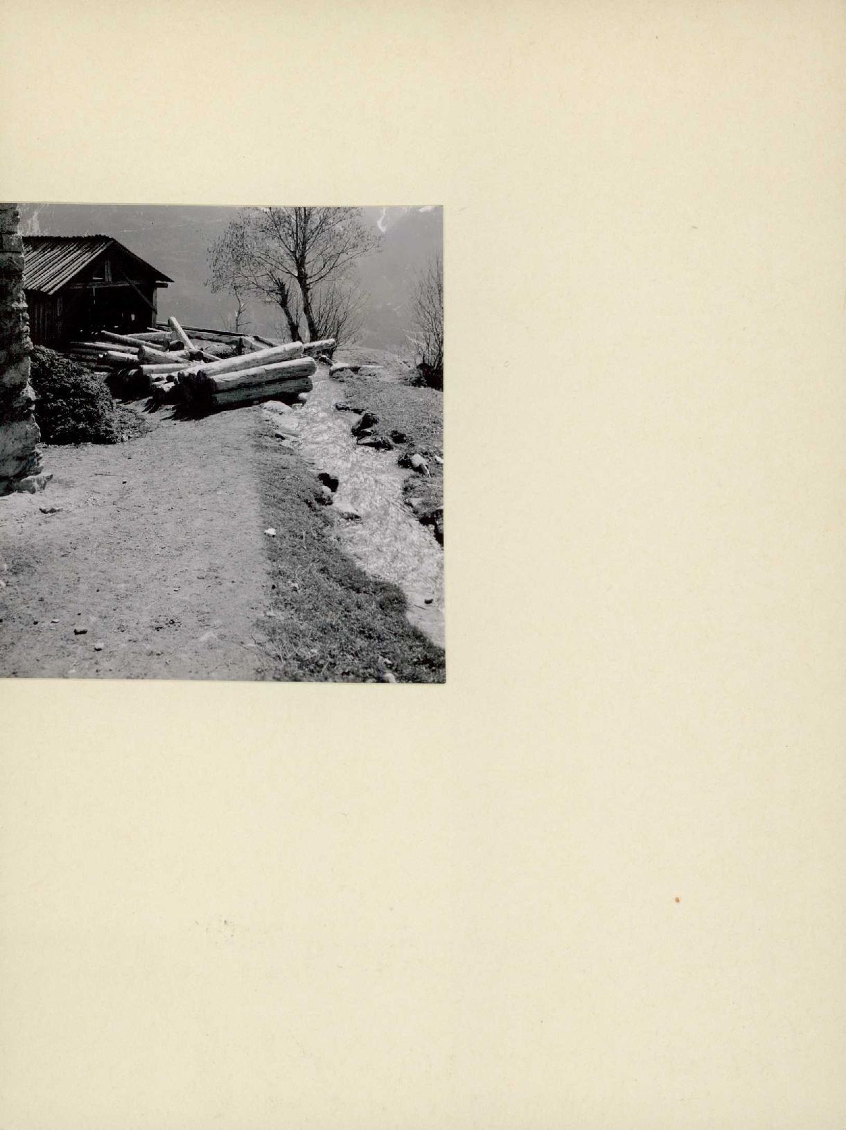 [Suone neben gestapelten Baumstämmen]