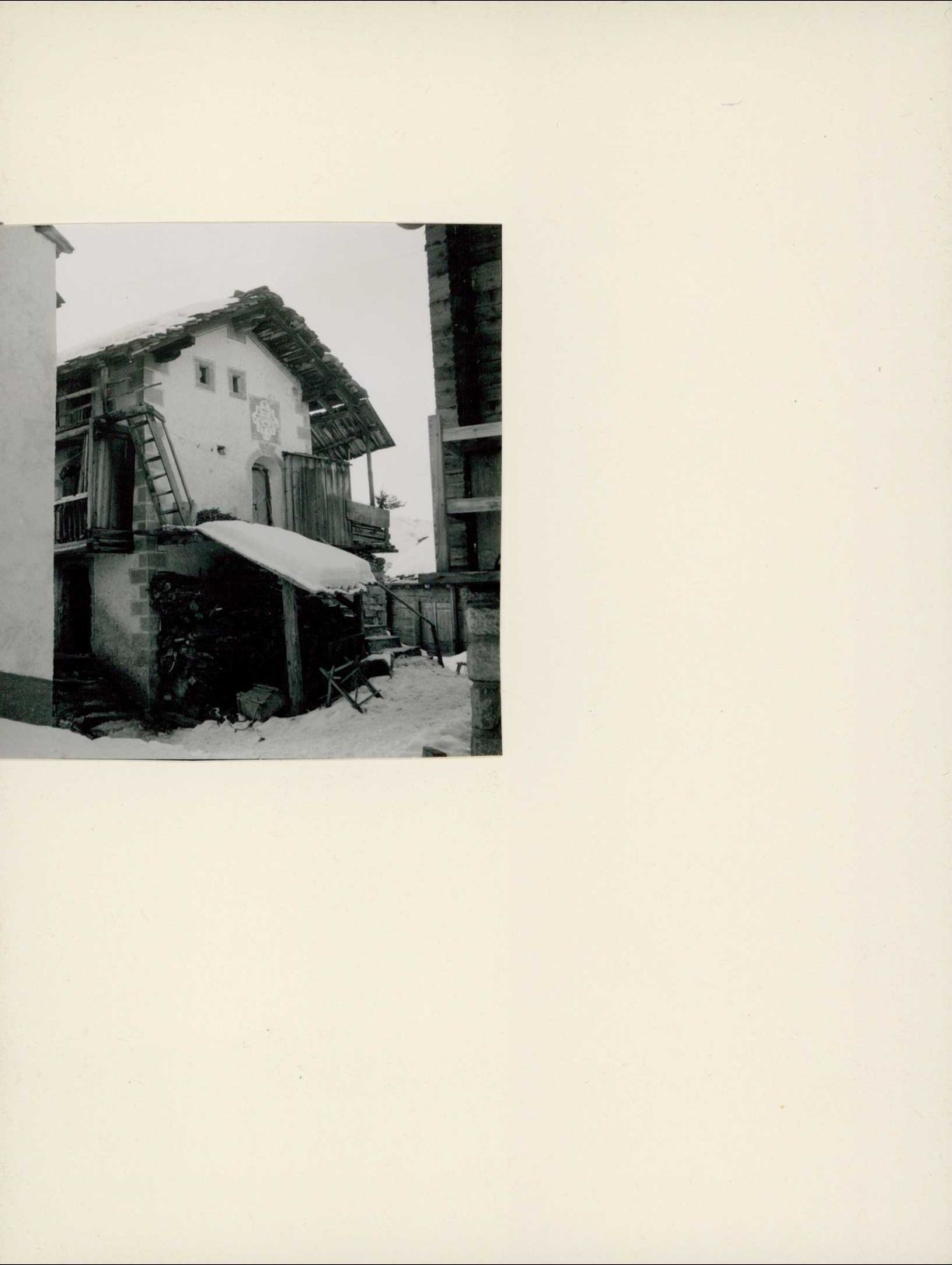 [Verschneites Steinhaus mit Wandbemalung]