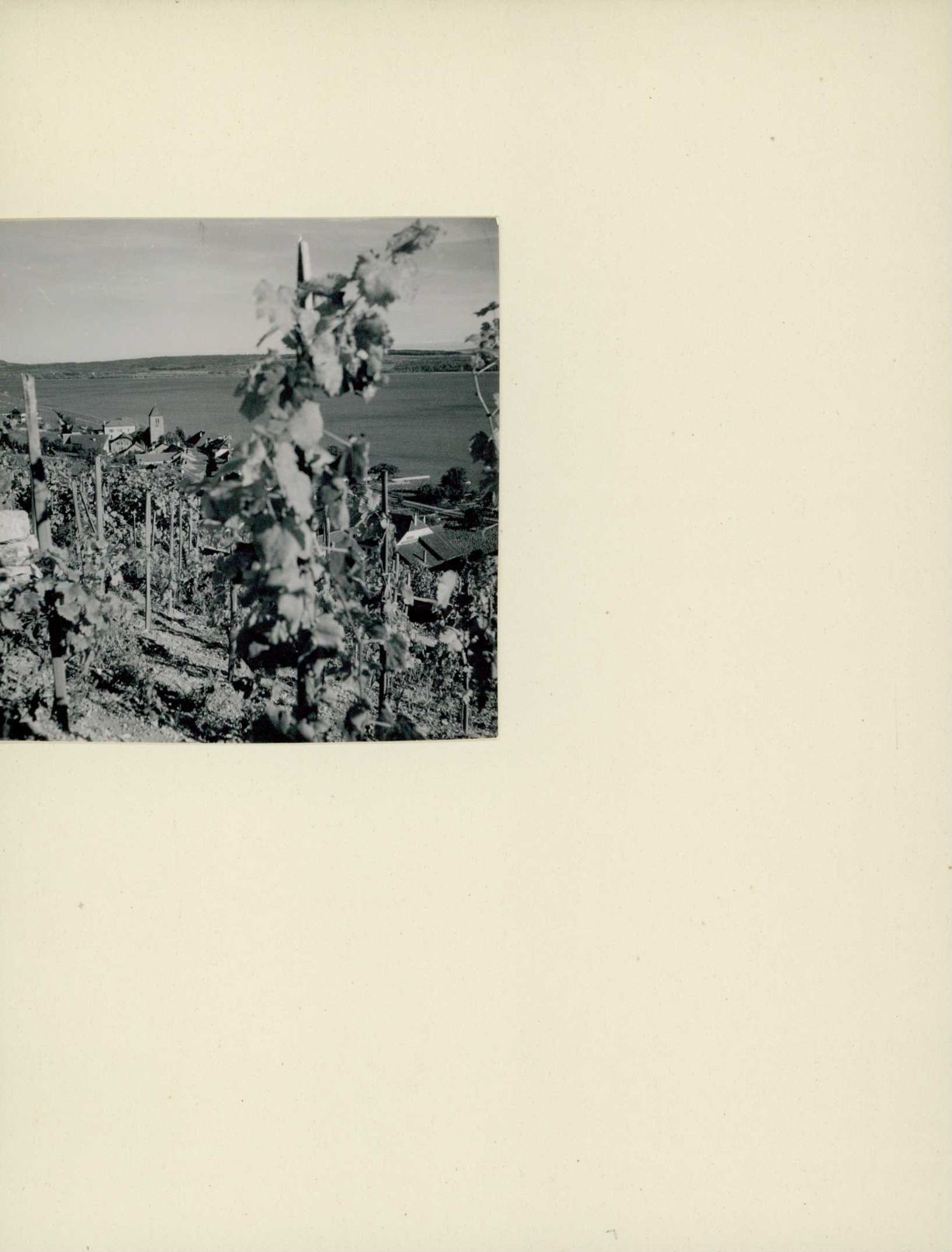 [Blick aus den Rebbergen auf das Dorf und den Bielersee]