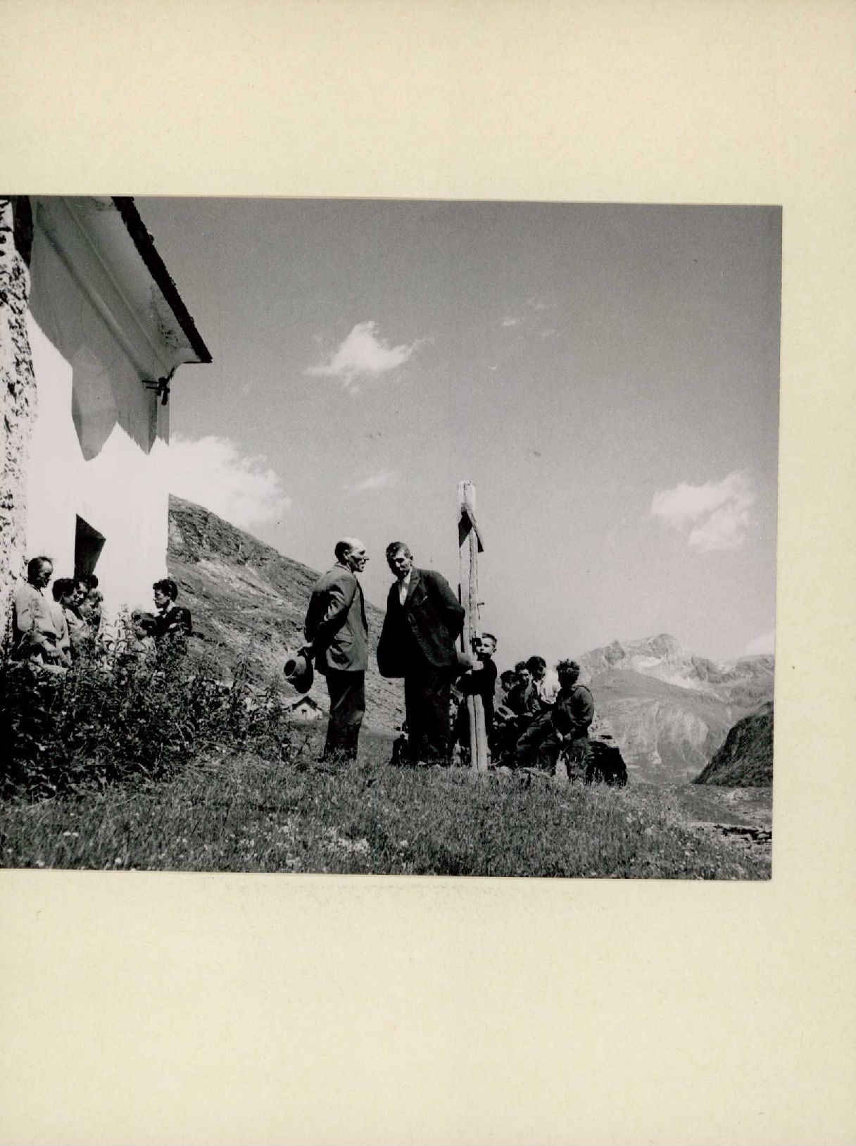 [Val di Lei: Versammelte Personengruppe vor einem Steinhaus und Holzkreuz]