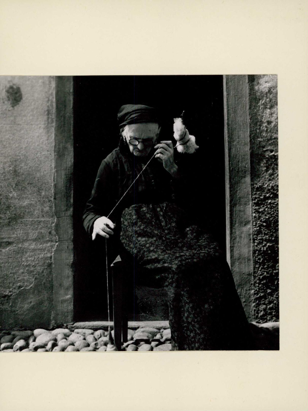 [Portrait einer älteren Frau beim Spinnen im Val Isone]