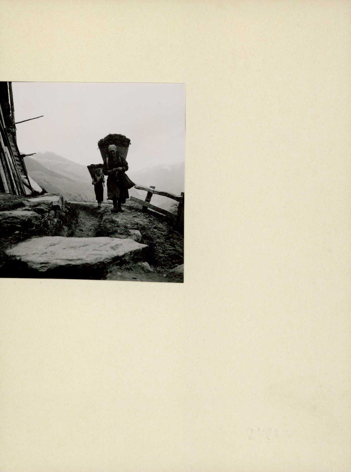 [Ida Berchtold und Sohn Walter beim Transport mit Tragkörben]