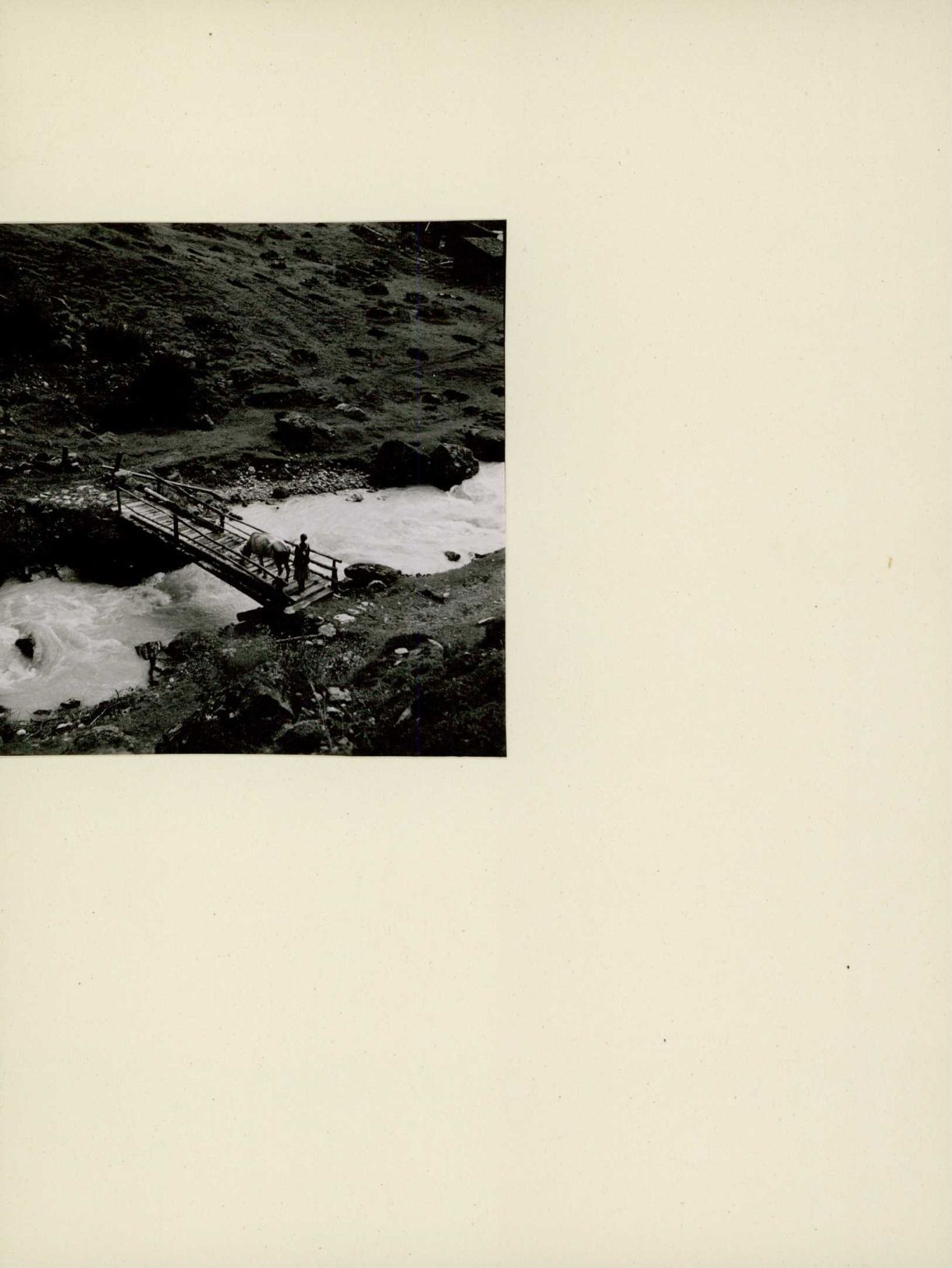 [Frau treibt Vieh über Holzbrücke]