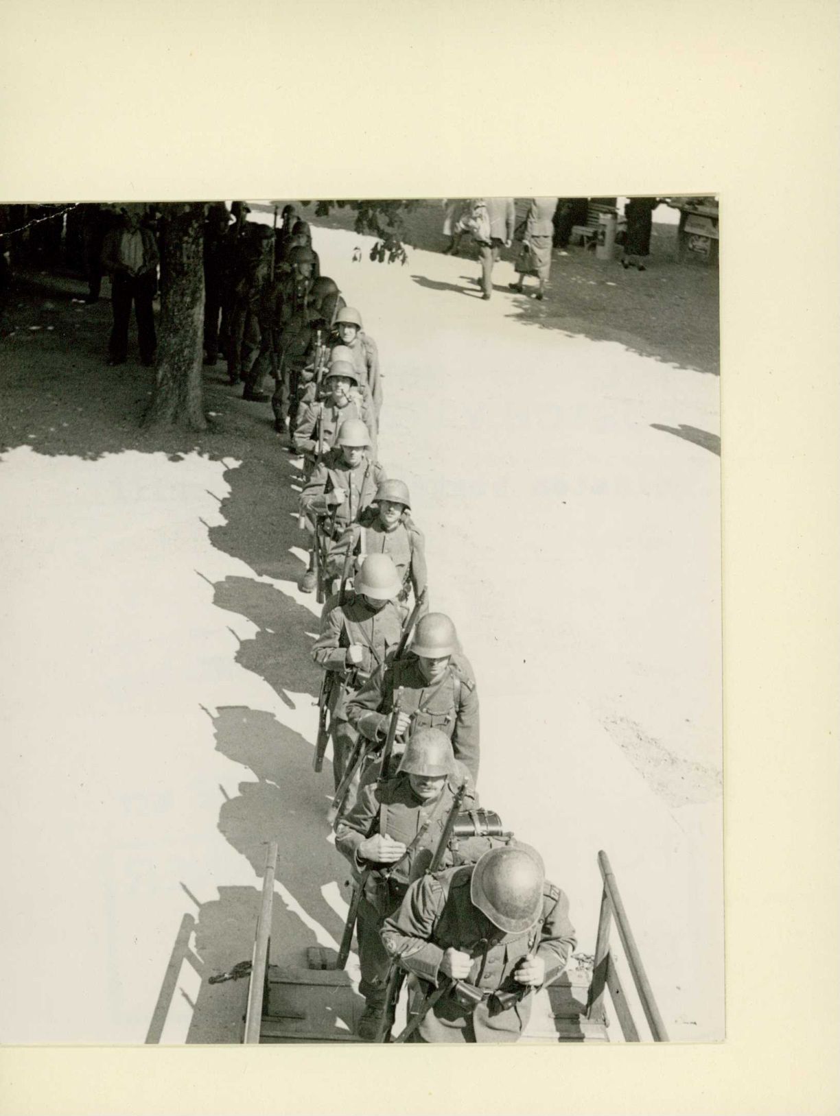 [Soldaten gehen an Bord eines Schiffs]