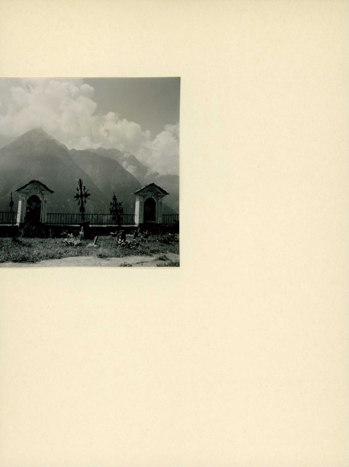 [Friedhof mit Bildstöcken und Grabkreuzen aus Eisen]