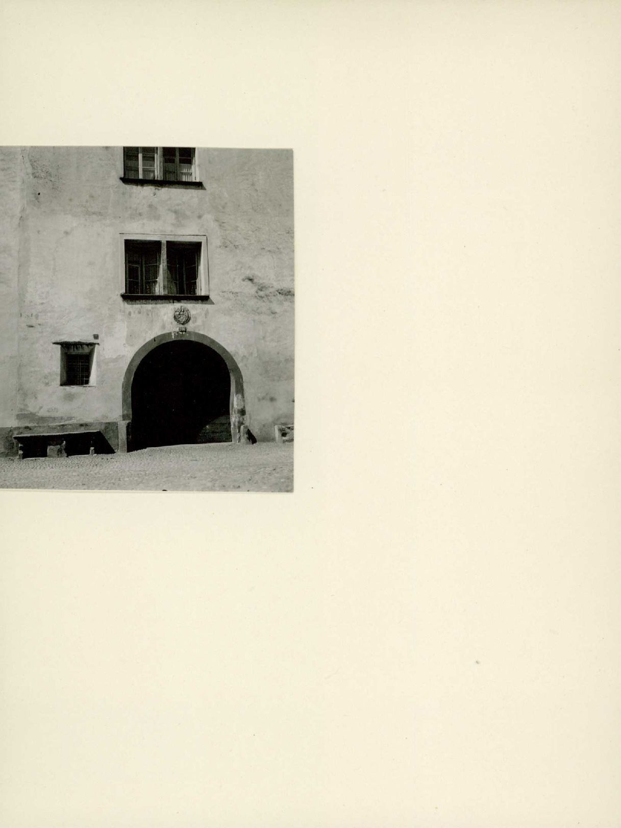 [Hauseingang mit einem Wappen über dem Tor]
