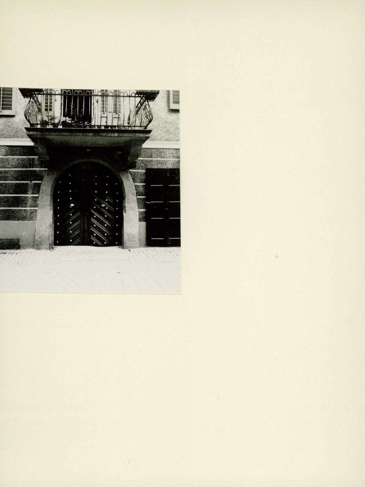 [Holztür zu einem Stadthaus. Darüber ein Balkon]