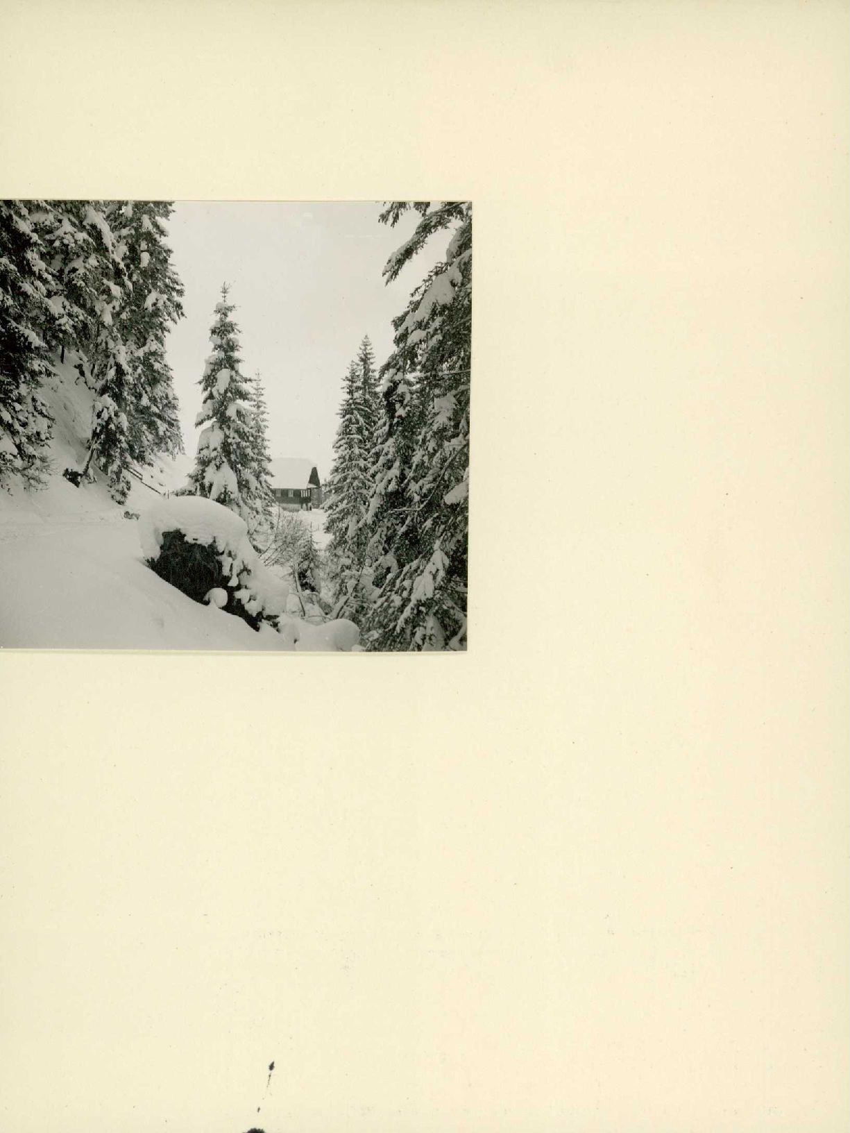 [Haus und verschneiter Wald]