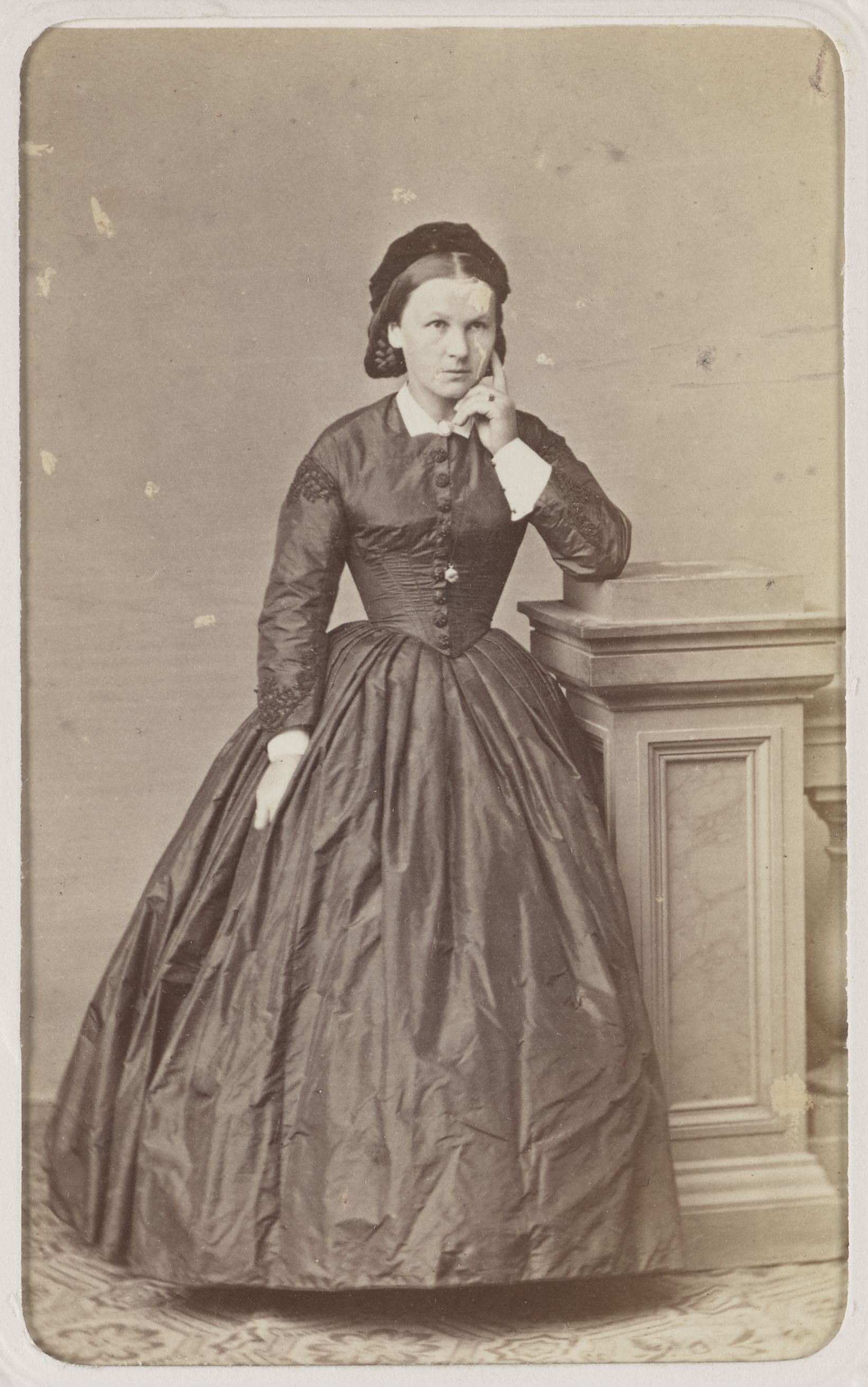 [Porträt einer Frau auf Geländer gestützt]
