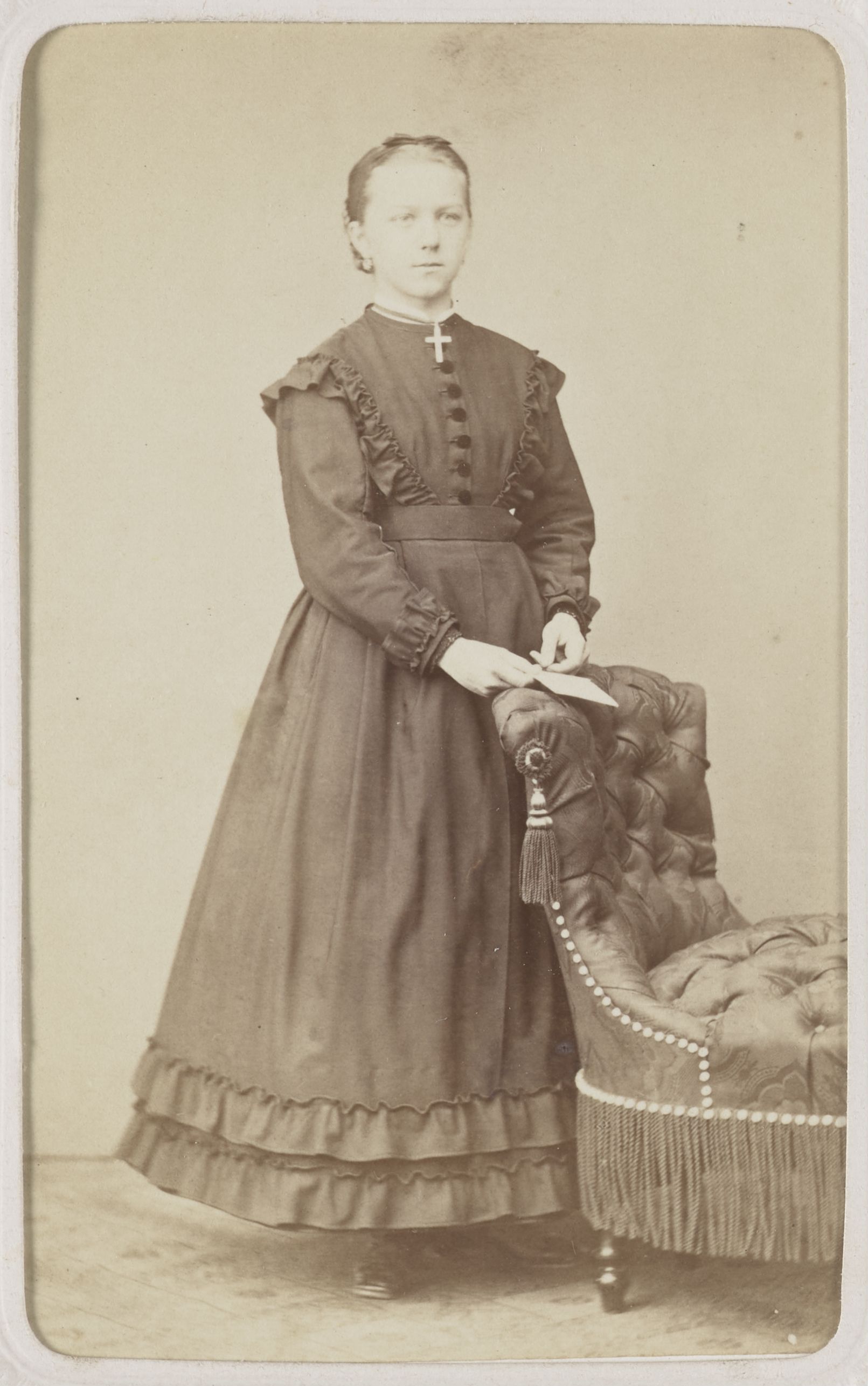 [Porträt einer stehenden jungen Frau mit Kreuz um Hals]