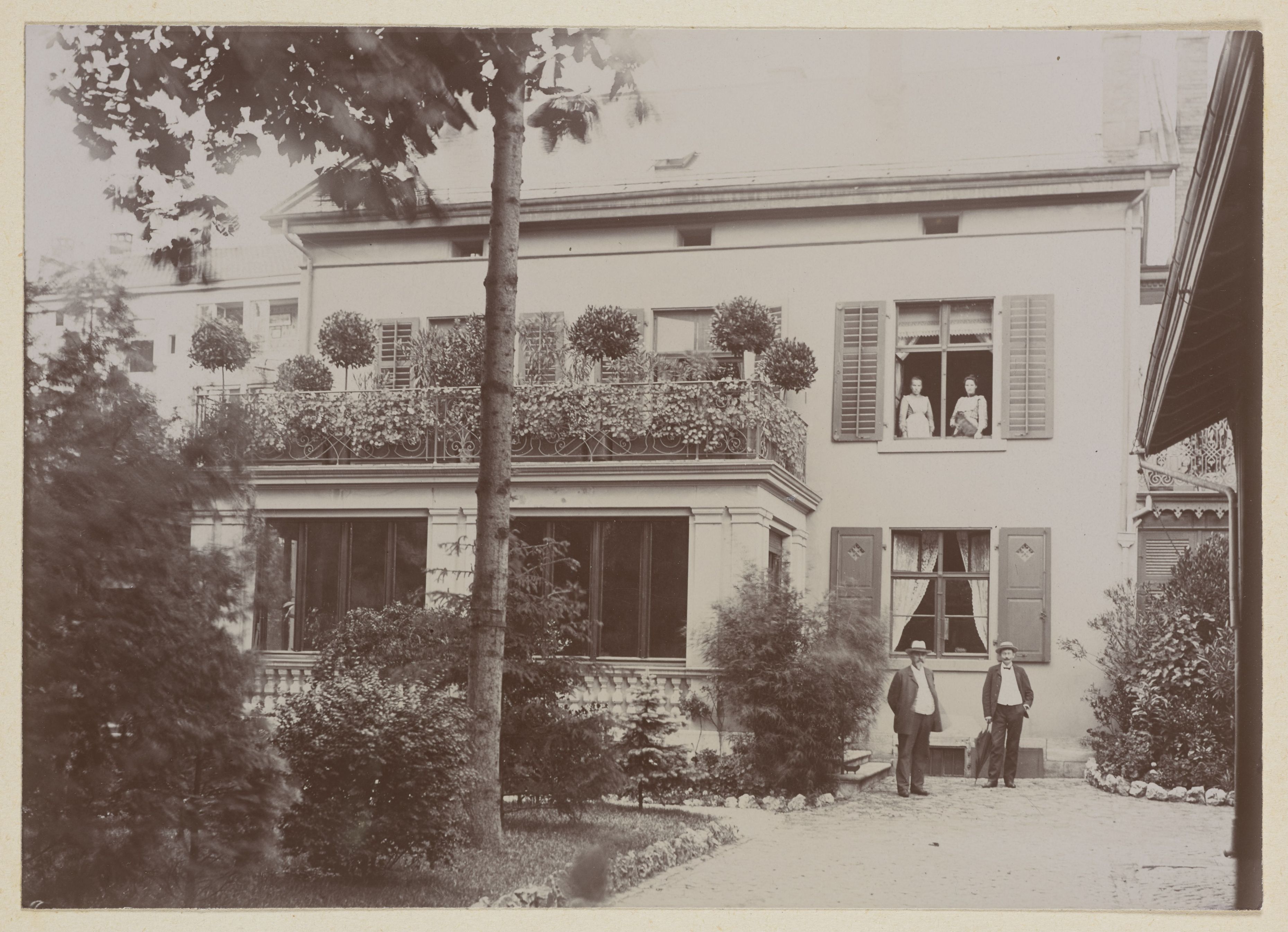 [Oscar Kreis, Bernhard Füglistaller vor Haus und zwei Frauen aus dem Fenster schauend]